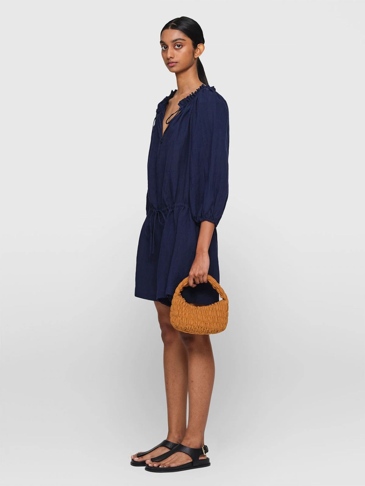 An effortless style you will reach for all summer long. This jumpsuit is made from featherweight washed linen and cut for a slightly loose shape. It features adjustable drawstring ties at the waist, and is gathered along the neckline, which is traced with delicate ruffles. Slip it on with slides or sneakers on relaxed days.