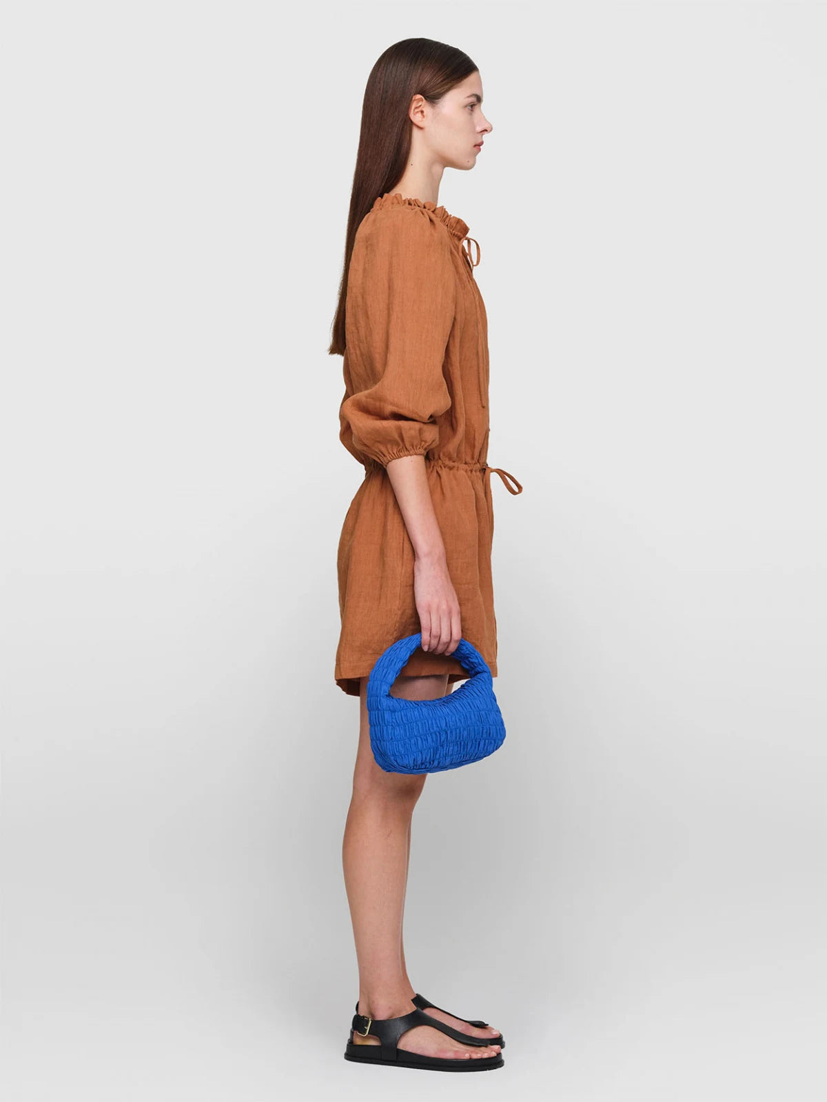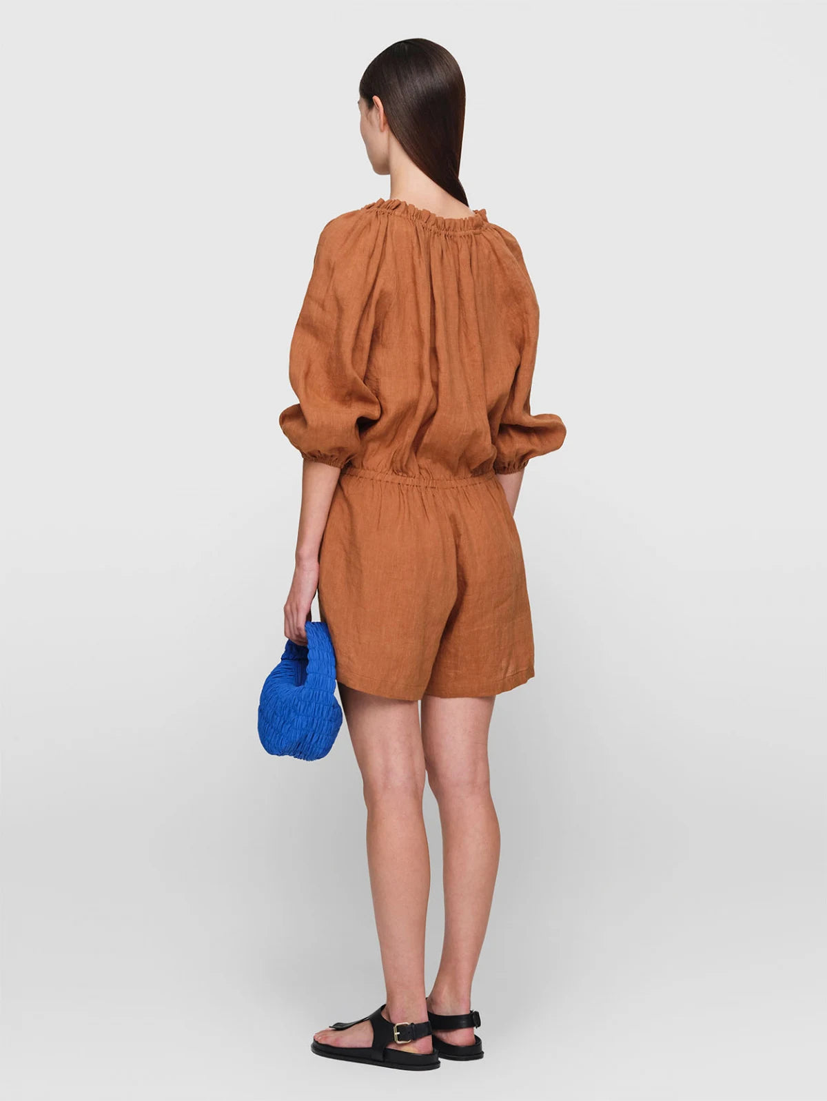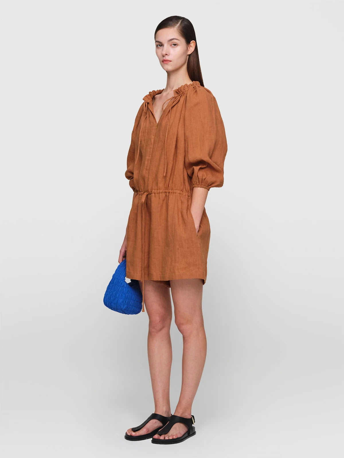 An effortless style you will reach for all summer long. This jumpsuit is made from featherweight washed linen and cut for a slightly loose shape. It features adjustable drawstring ties at the waist, and is gathered along the neckline, which is traced with delicate ruffles. Slip it on with slides or sneakers on relaxed days.