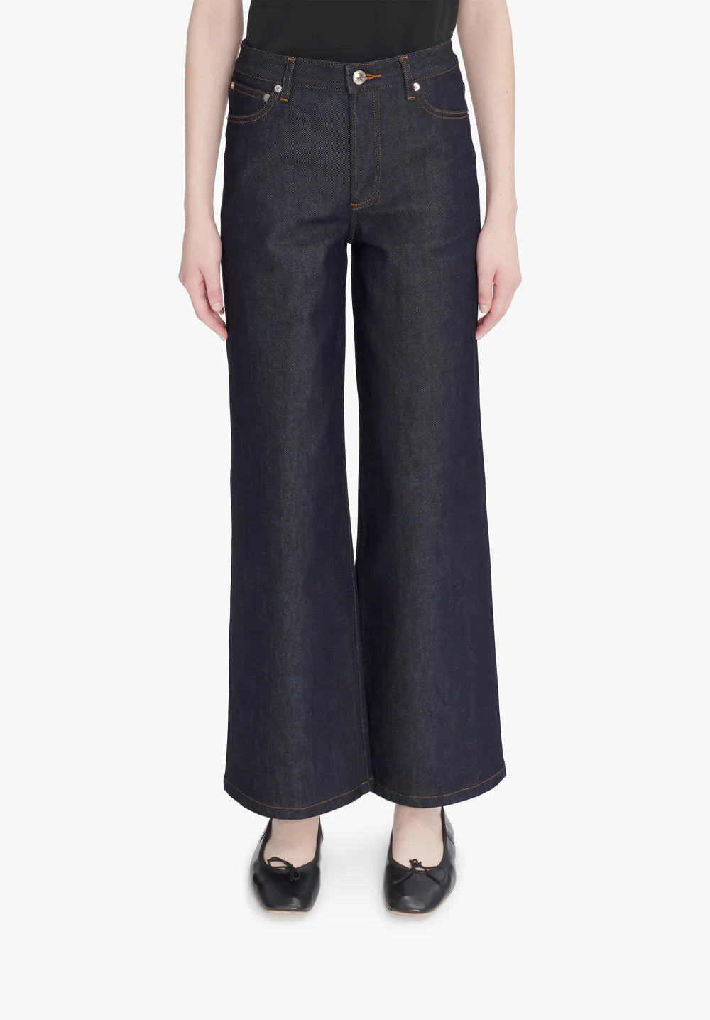 A.P.C. Jean Elisabeth 70s-style wide-leg jeans in indigo Japanese organic cotton denim.