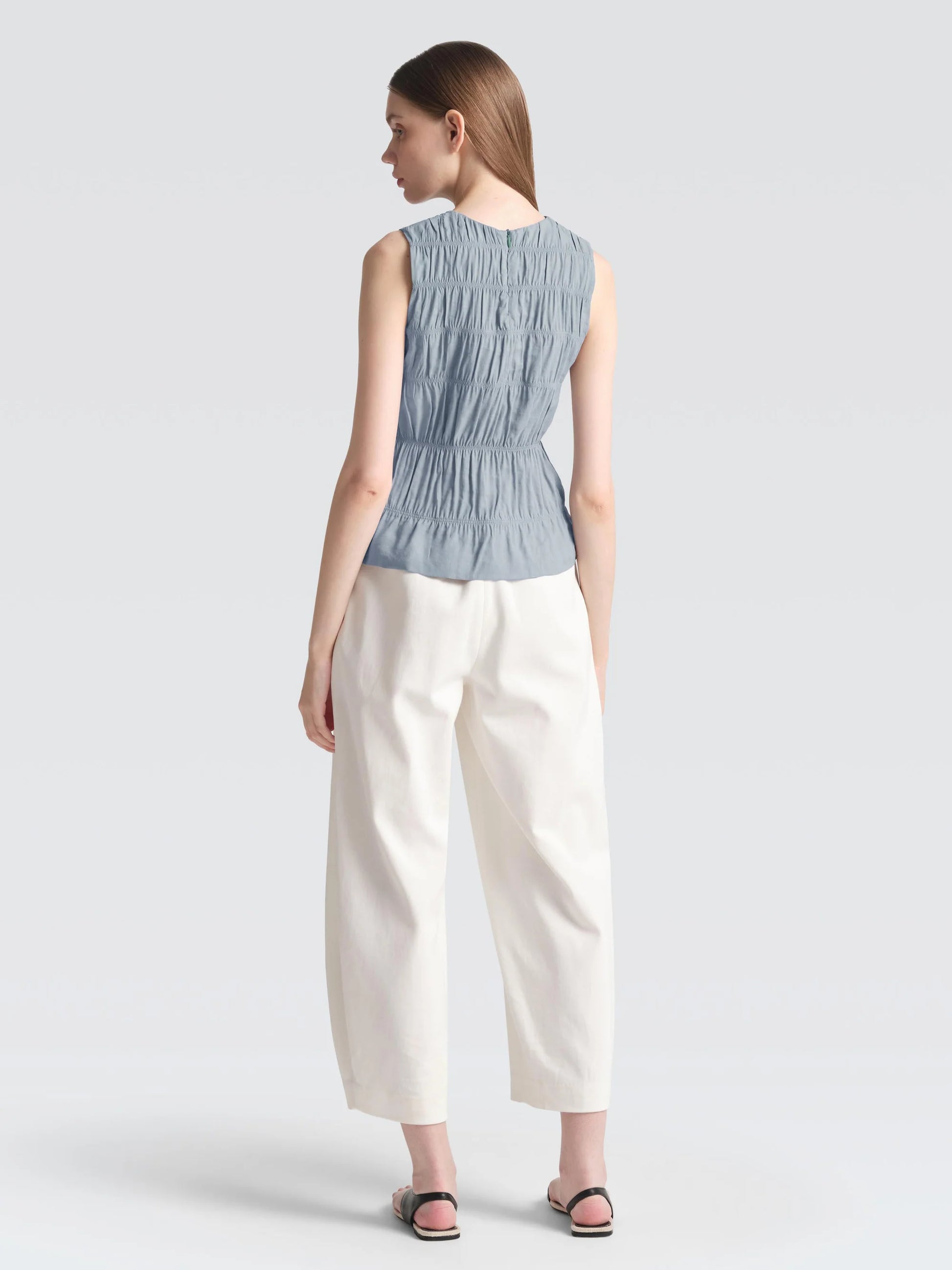 A study in texture and fit, the HANNEKE top is crafted from linen rayon and detailed with hand-controlled shirring that makes every piece one-of-a-kind. Fitted and flattering, it works beautifully with tailored trousers or shorts for a polished, modern off-duty look.