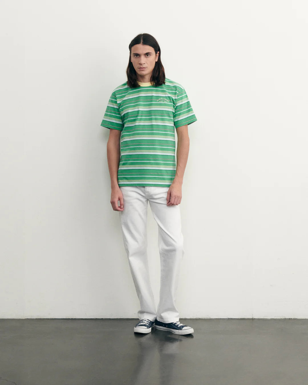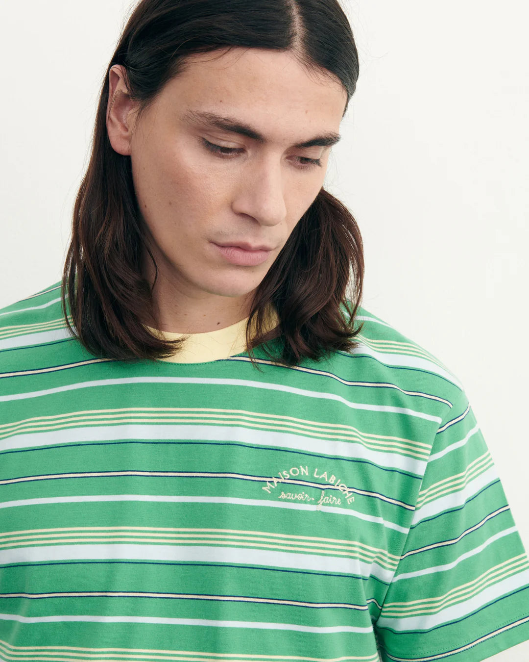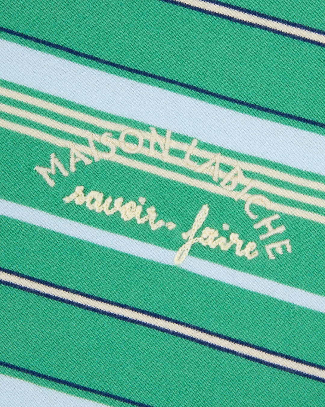 This 'Patureau Mini Manufacture' t-shirt by Maison Labiche is made from GOTS certified cotton with cactus green stripes.
