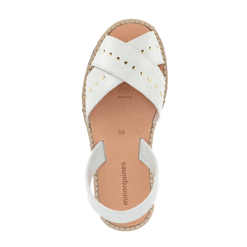 Sandals with two strips crossed on the top of the foot in white leather with aged appearance and golden metallic rivets.