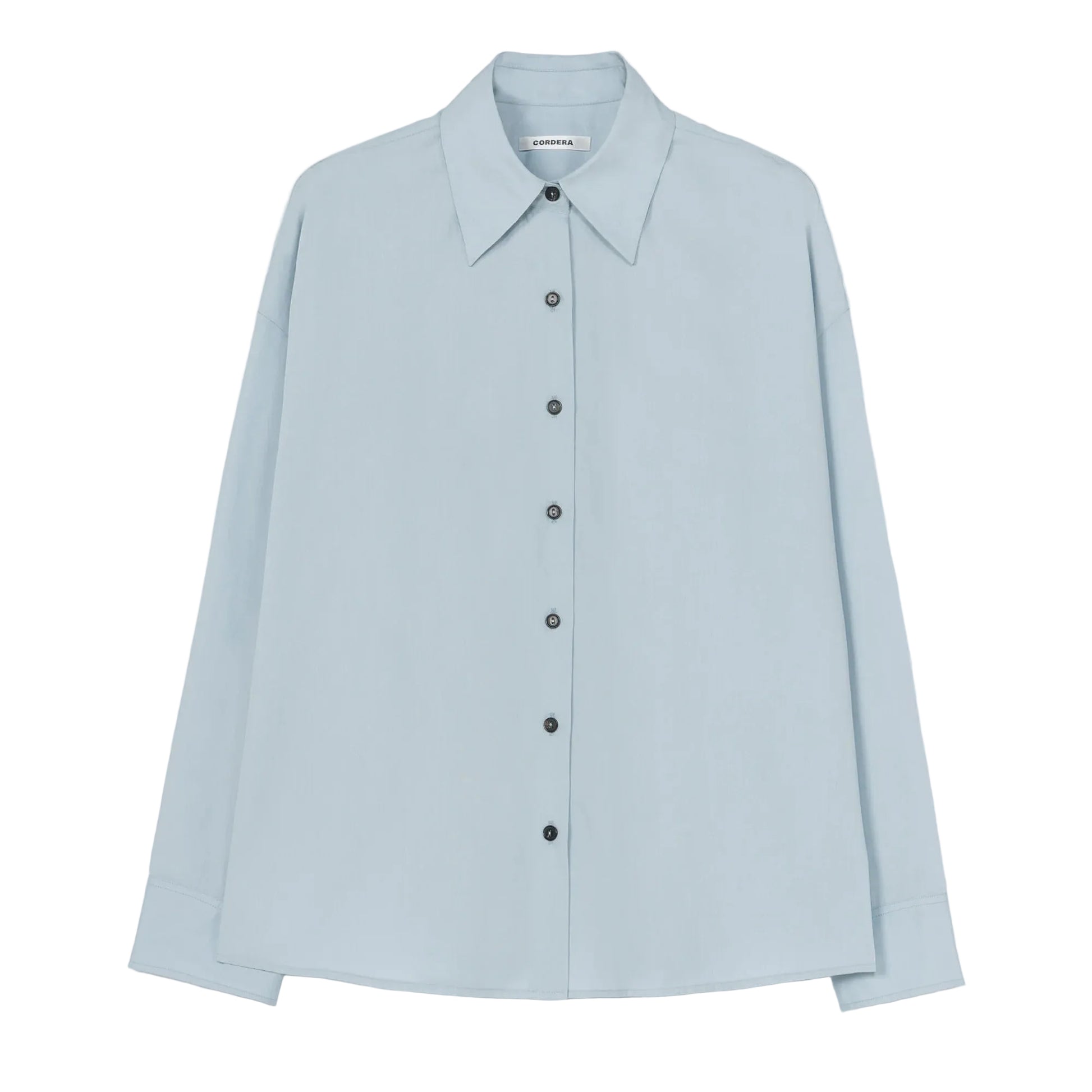 This oversized shirt features a relaxed, flowing silhouette with a soft, slightly structured back. Crafted in a solid, versatile baby blue, it’s finished with an Italian collar and a front button closure. A timeless essential that blends ease, simplicity, and everyday elegance.