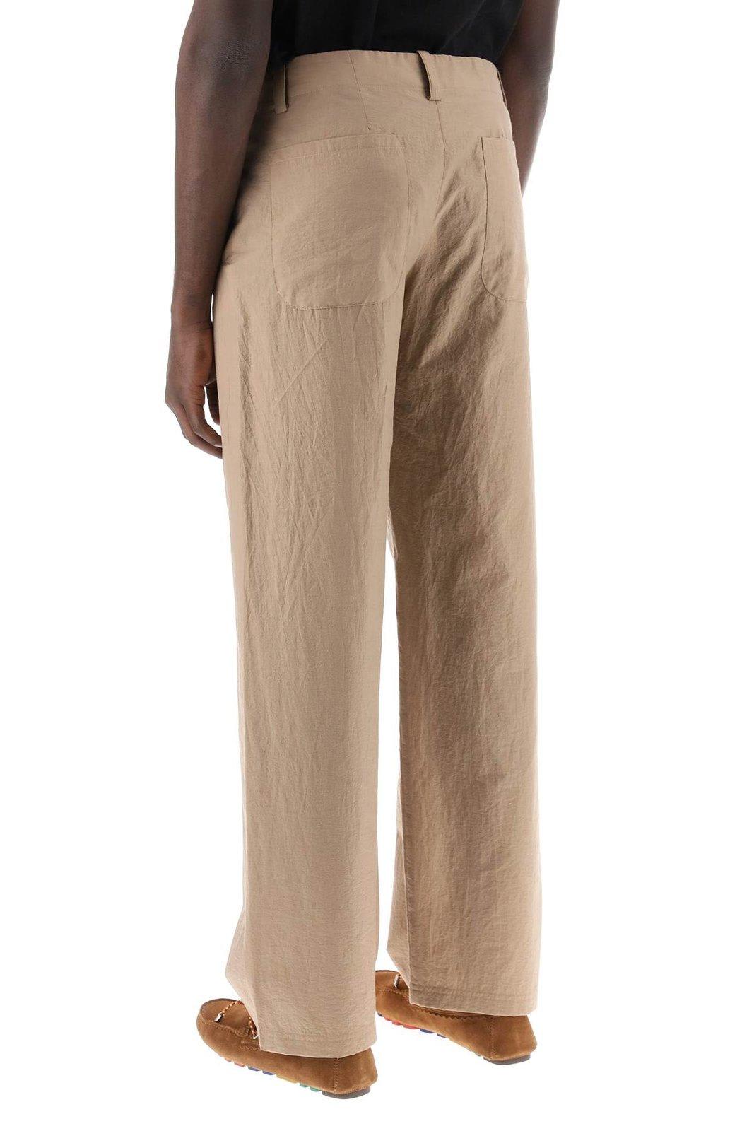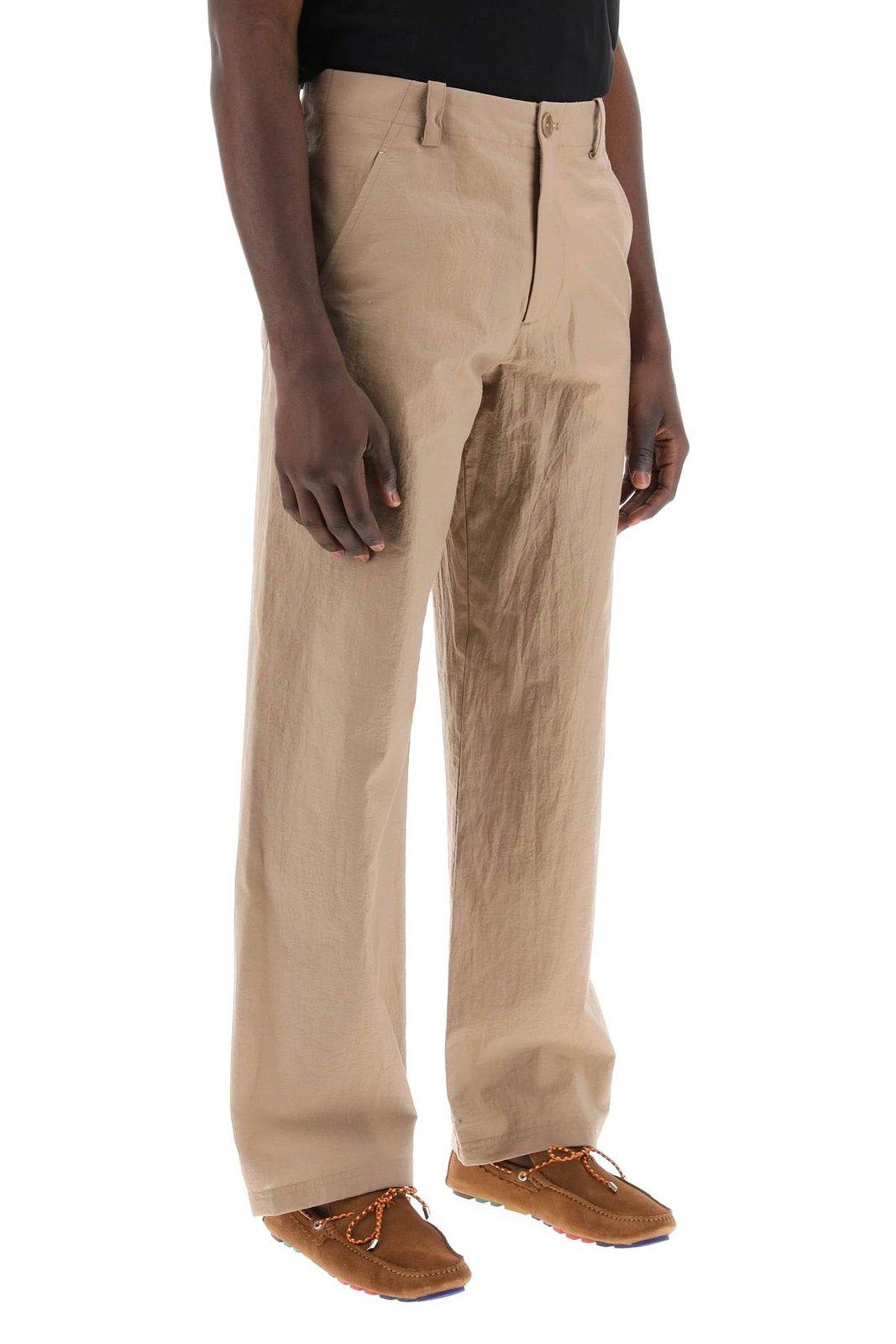 The Mathurin A.P.C. pants are made of lightweight techno cotton crepe with a wide leg. They feature a hidden zip and button closure, slanted side pockets, patch back pockets, and belt loops. The model is 187 cm tall and wears size IT 48.