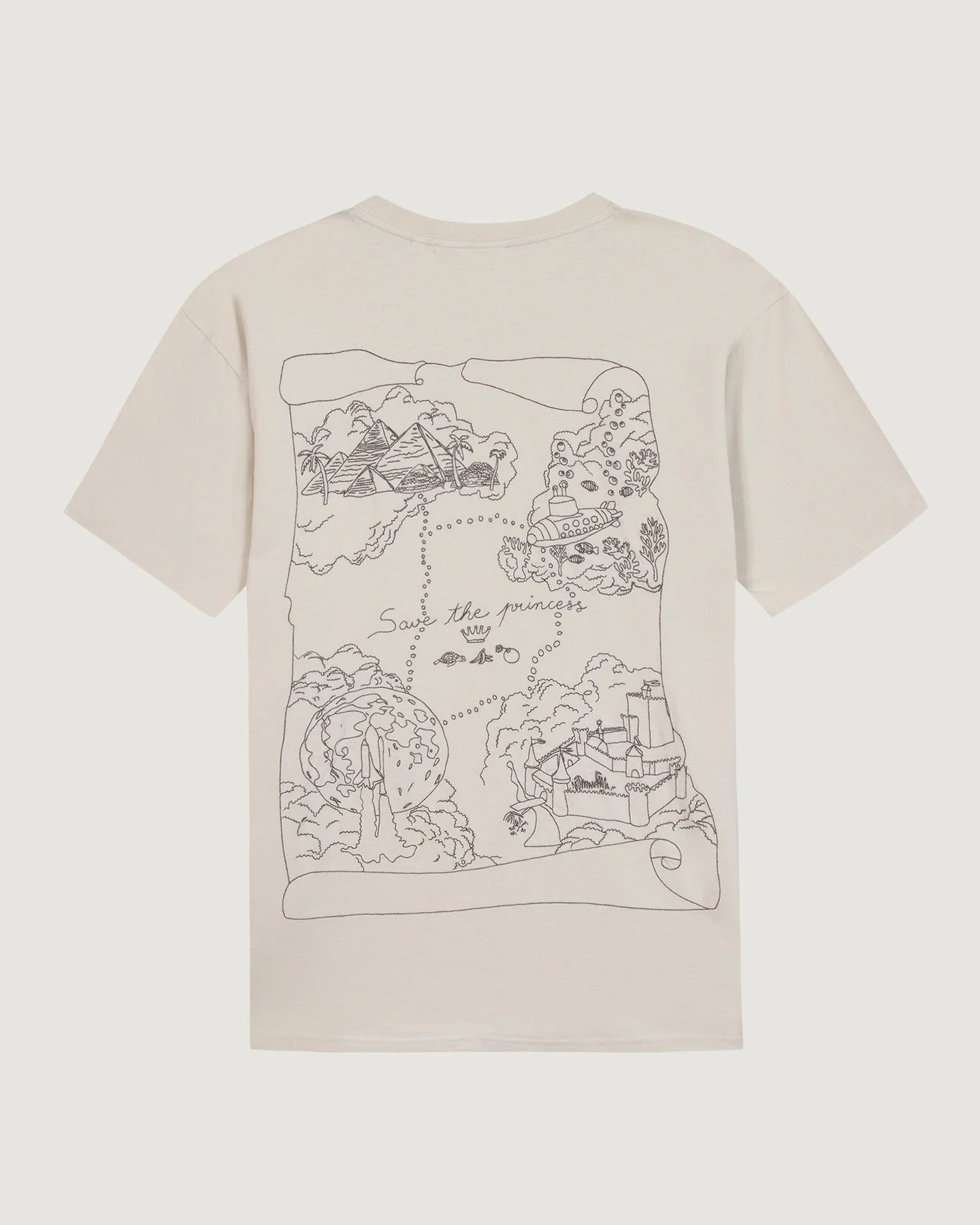 Our must-have Patureau T-shirt has a loose fit, a ribbed neckline, double needle finishes at the bottom of the sleeves and body. Its embroidery shows the journey to save the princess.