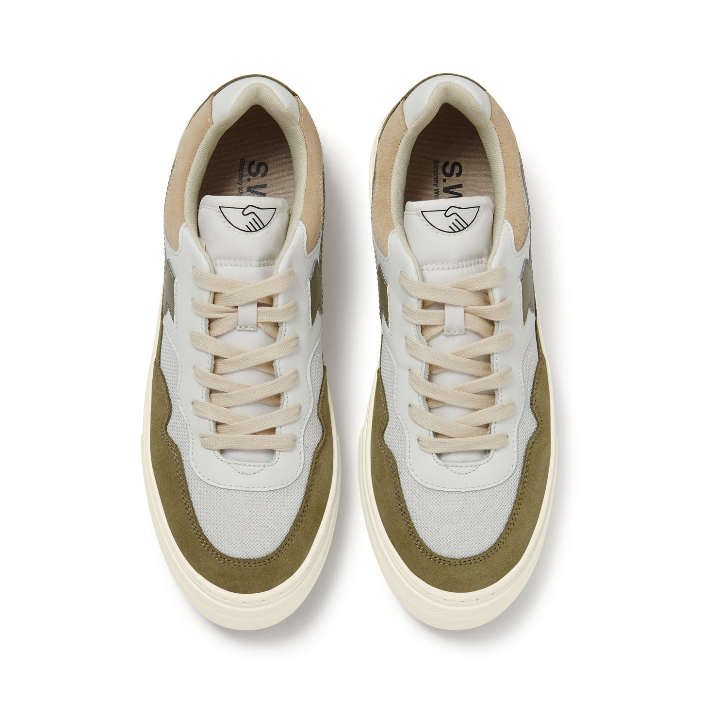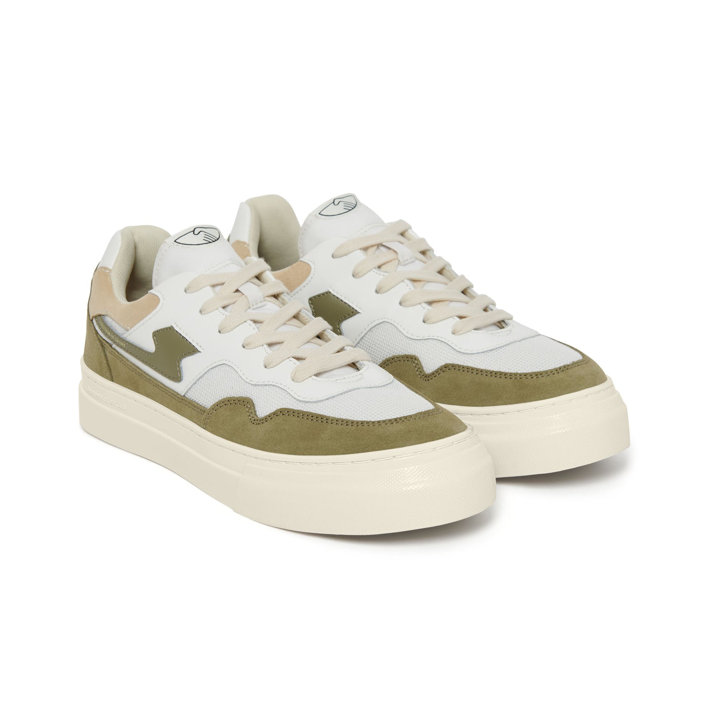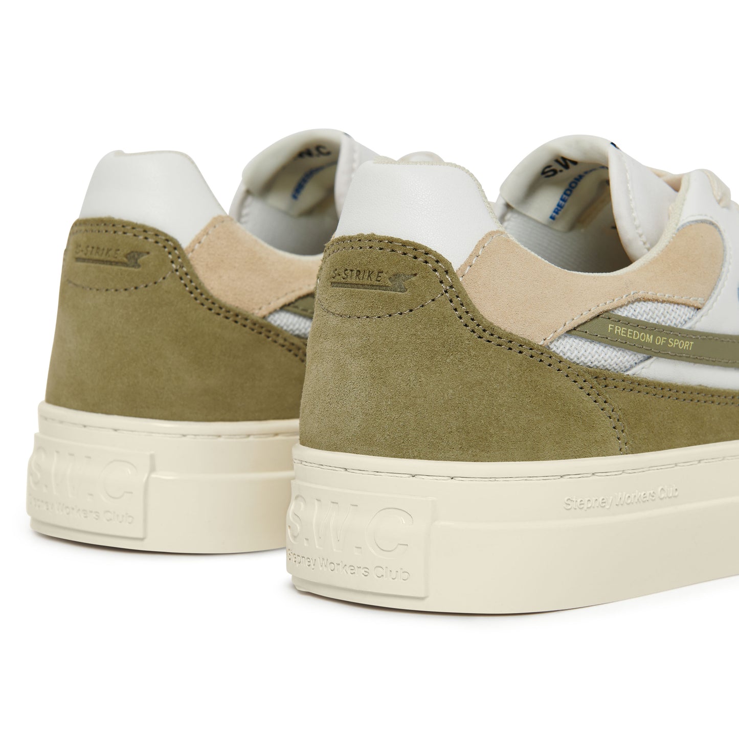These sneakers feature a white suede mix with a moss accent and pearl 'S Strike' detail for a stylish look.