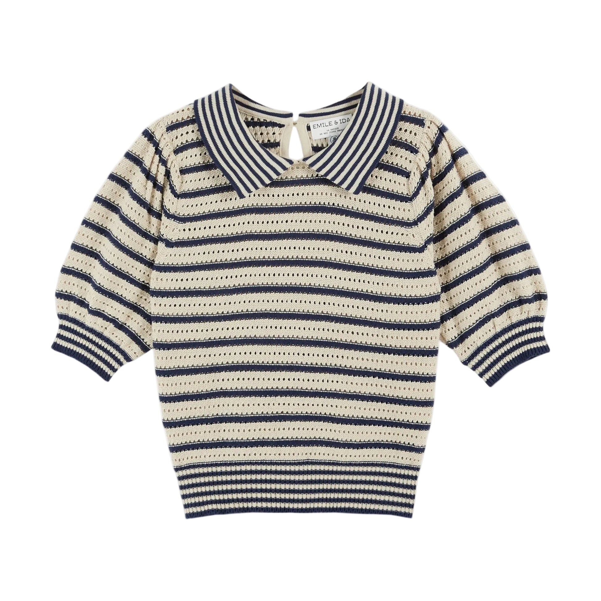 Crocheted polo shirt in organic cotton with ecru and navy blue stripes.