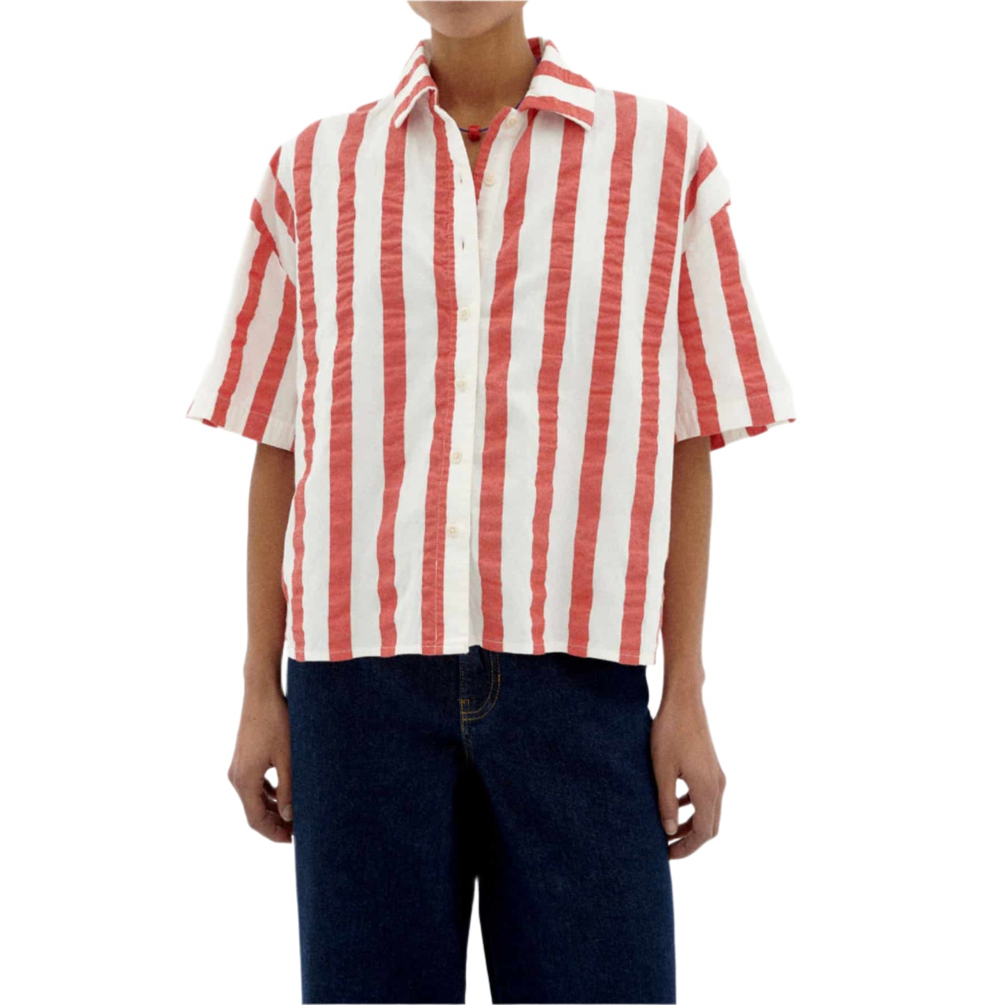 This short-sleeve blouse features bold red maxi stripes for a striking look.