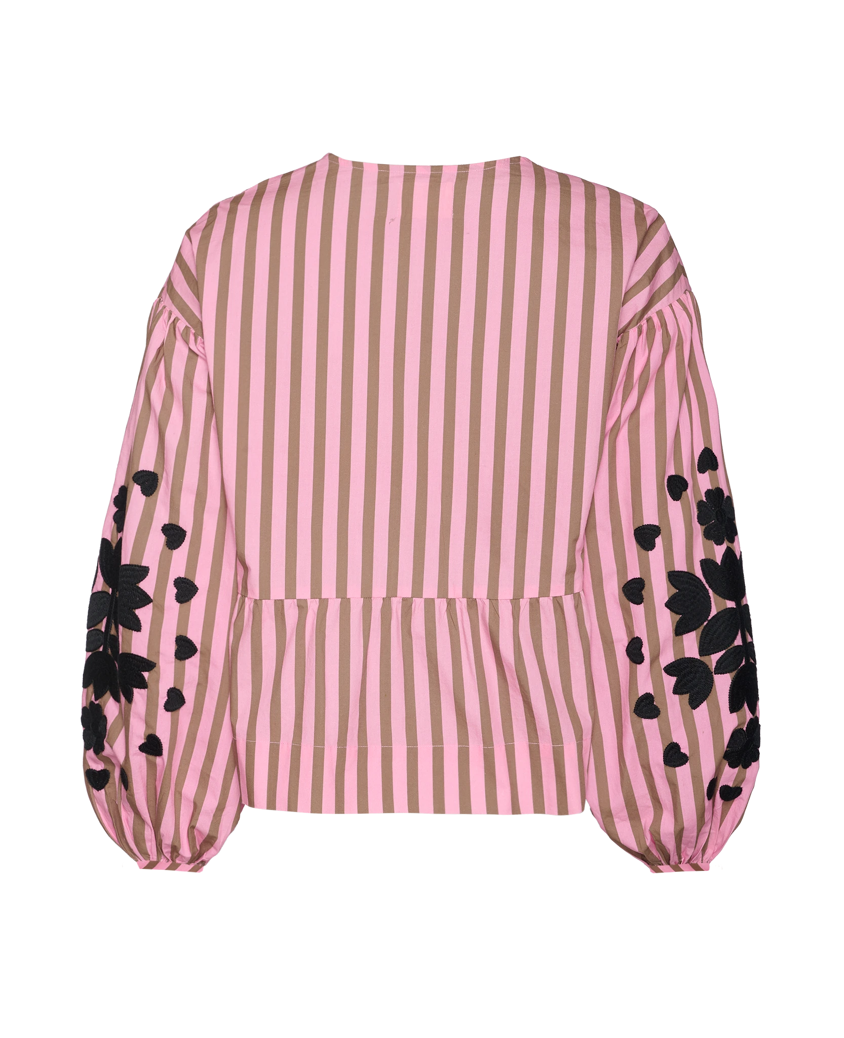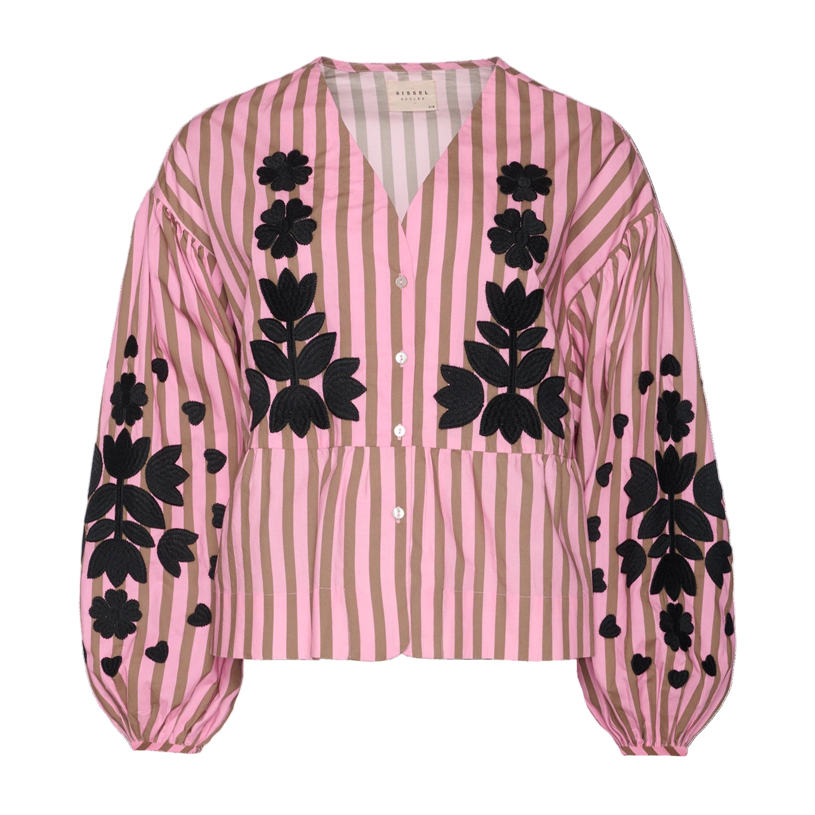 Rikke Top is a loose, feminine top made in 100% organic cotton poplin. The top has dropped shoulders and wide balloon sleeves with elastic at the sleeve openings. It features a V-neckline and can be closed with rhinestone buttons. The top is delicately decorated with voluminous embroidery artwork in a contrast color. The embroidery is placed on the chest and the outside of the sleeves.