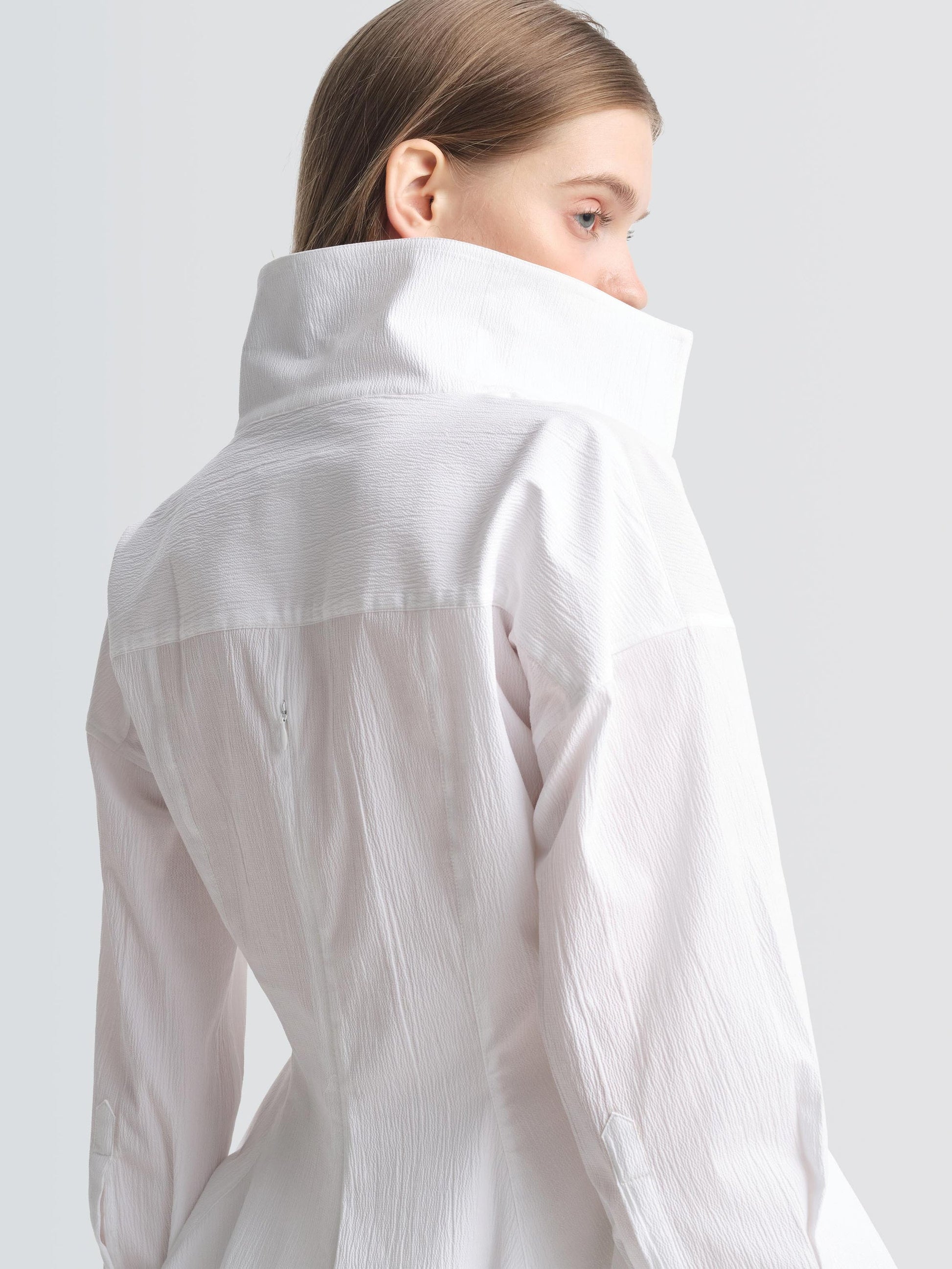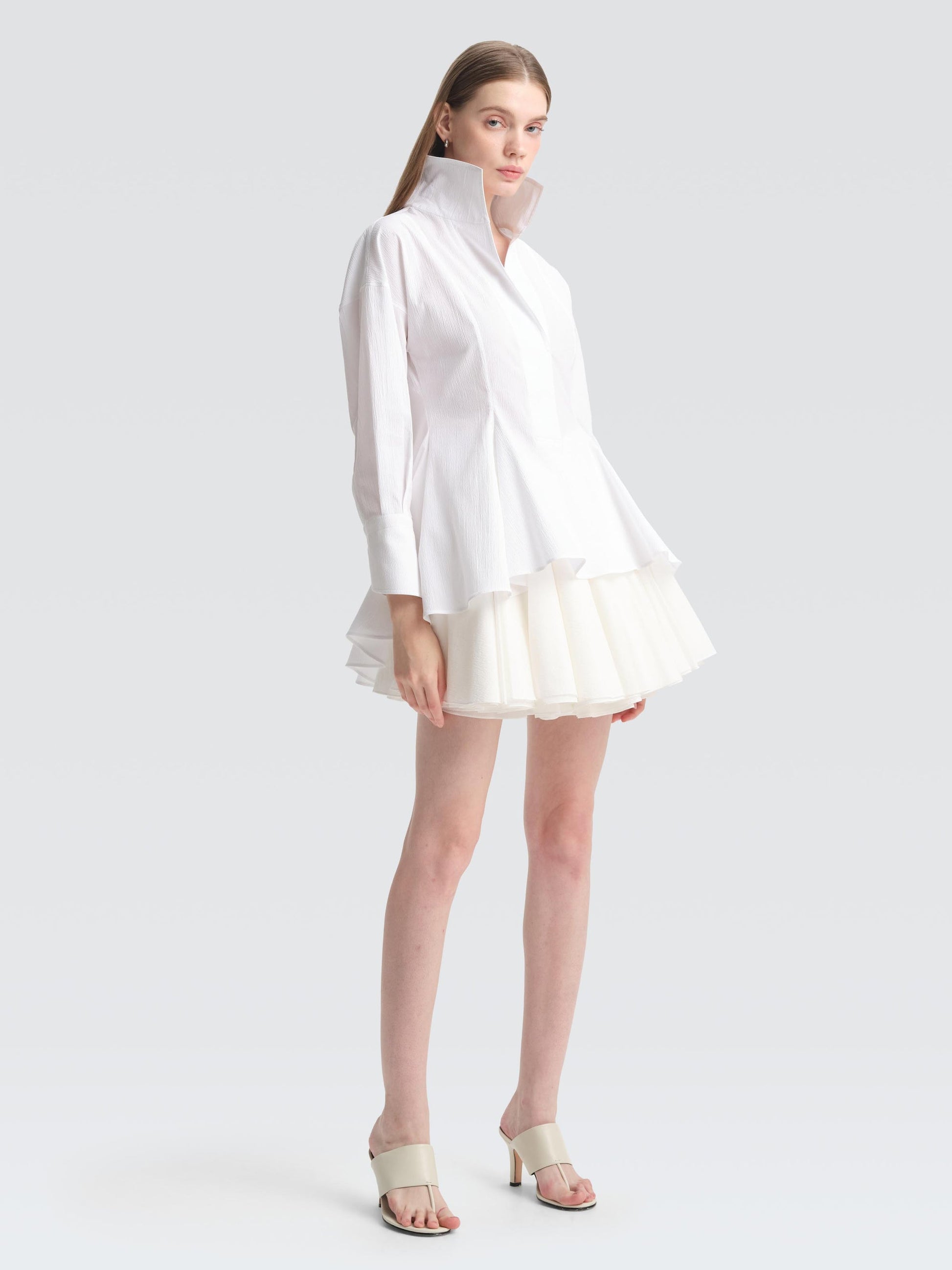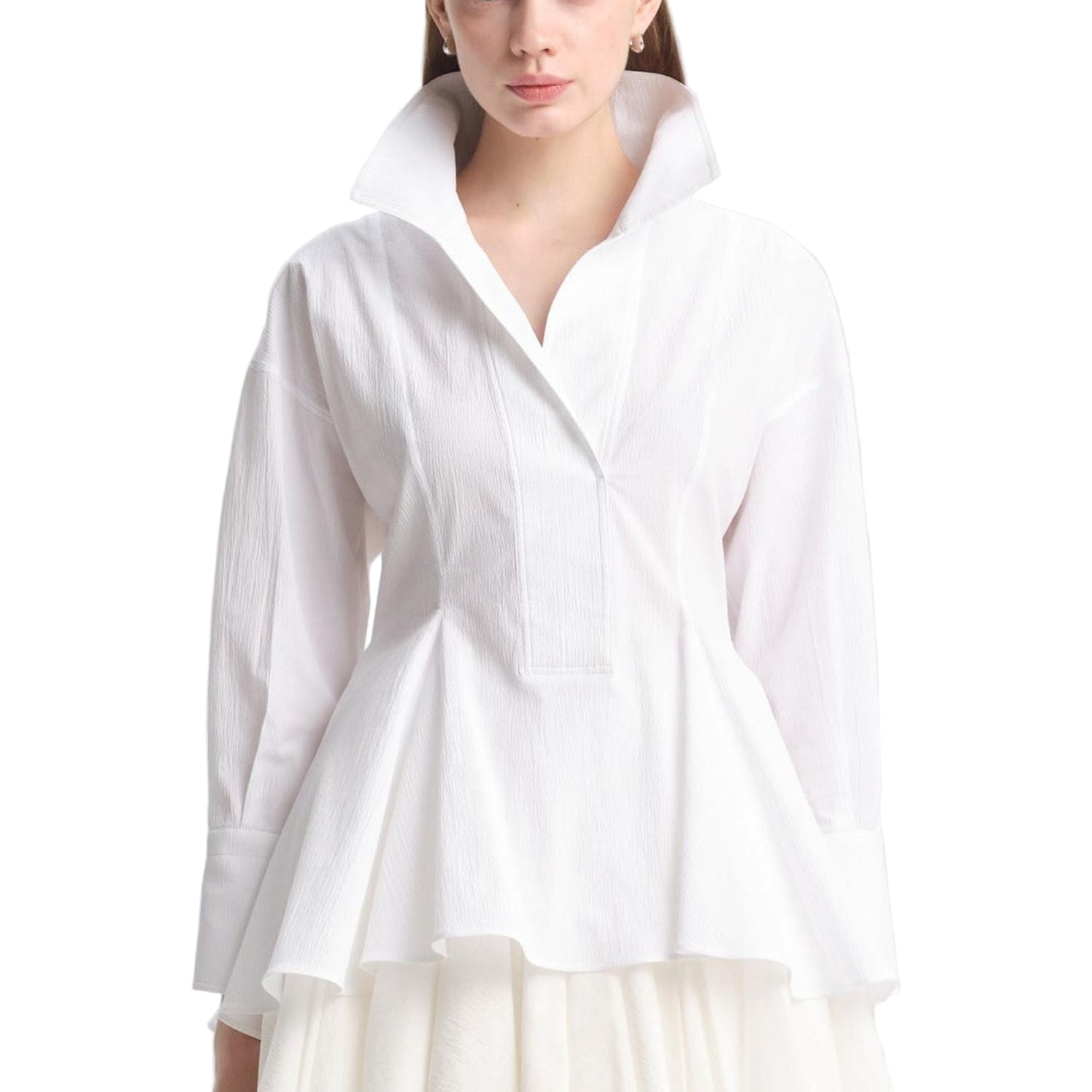 Tailored from crisp seersucker, the CONROY shirt features an open collar and body-skimming darts that flare into a graduated, fluted hem. Wear it over the STARLING skirt as styled, or pair it with sleek trousers to move effortlessly from work to dinner.