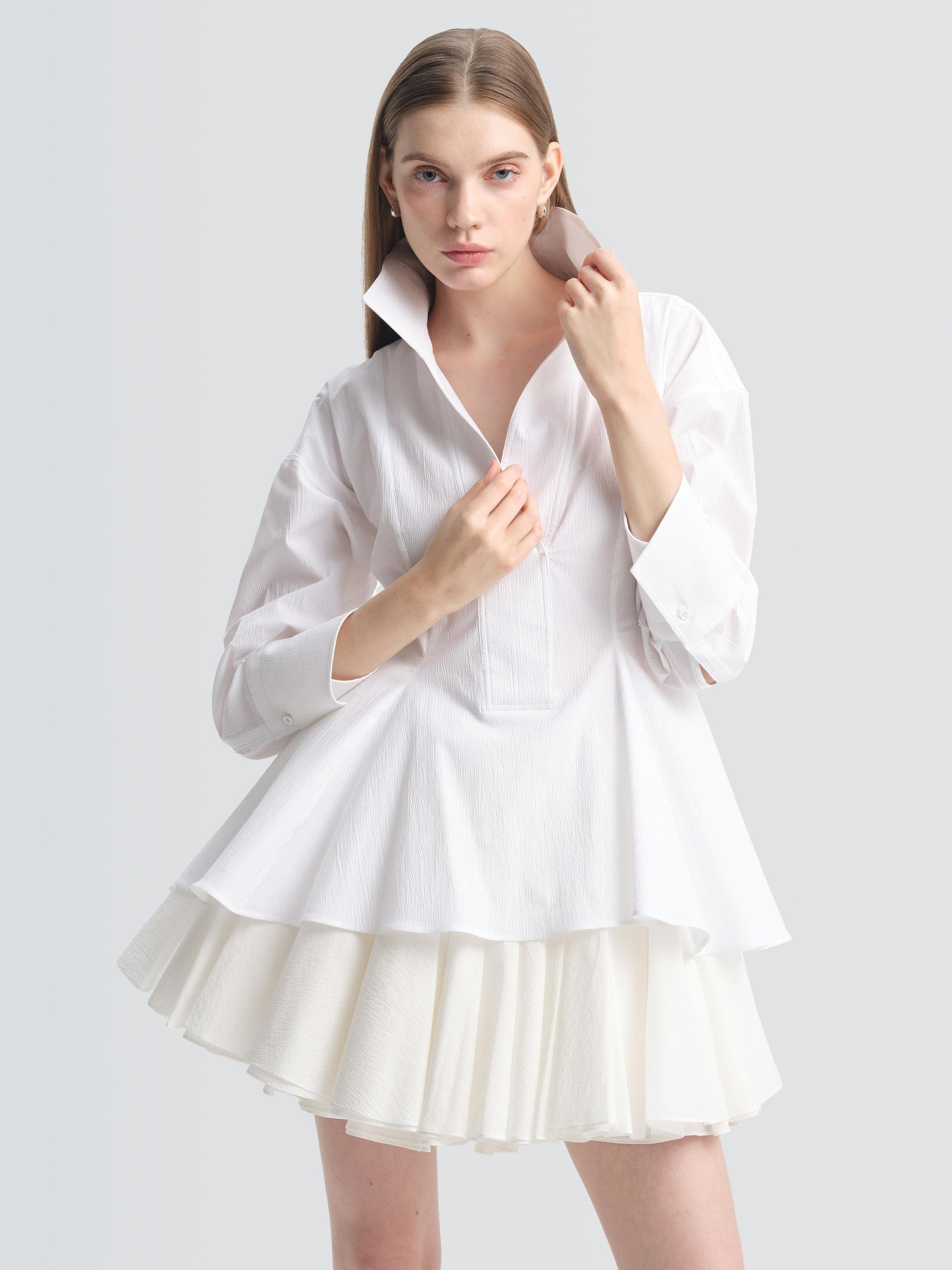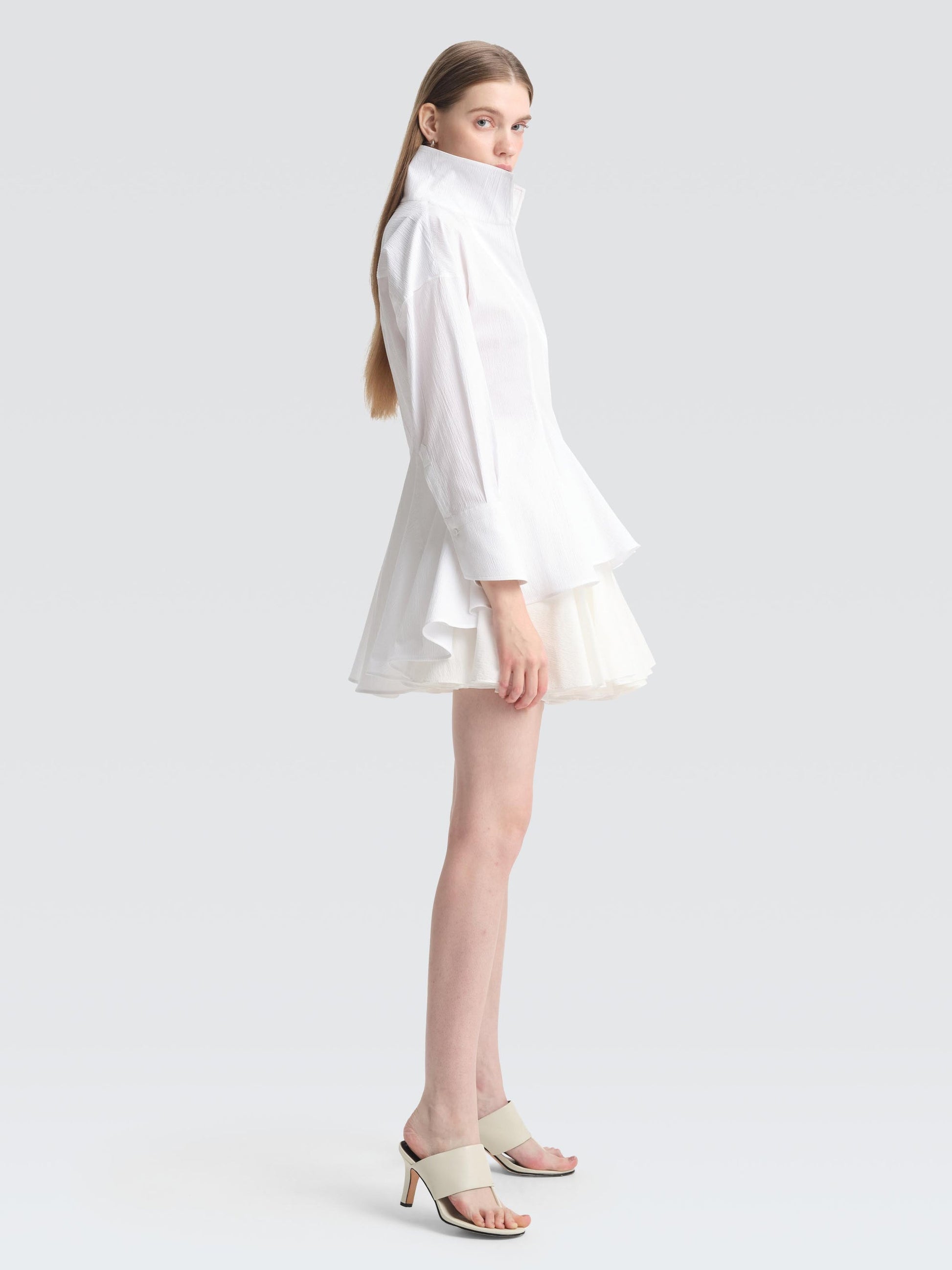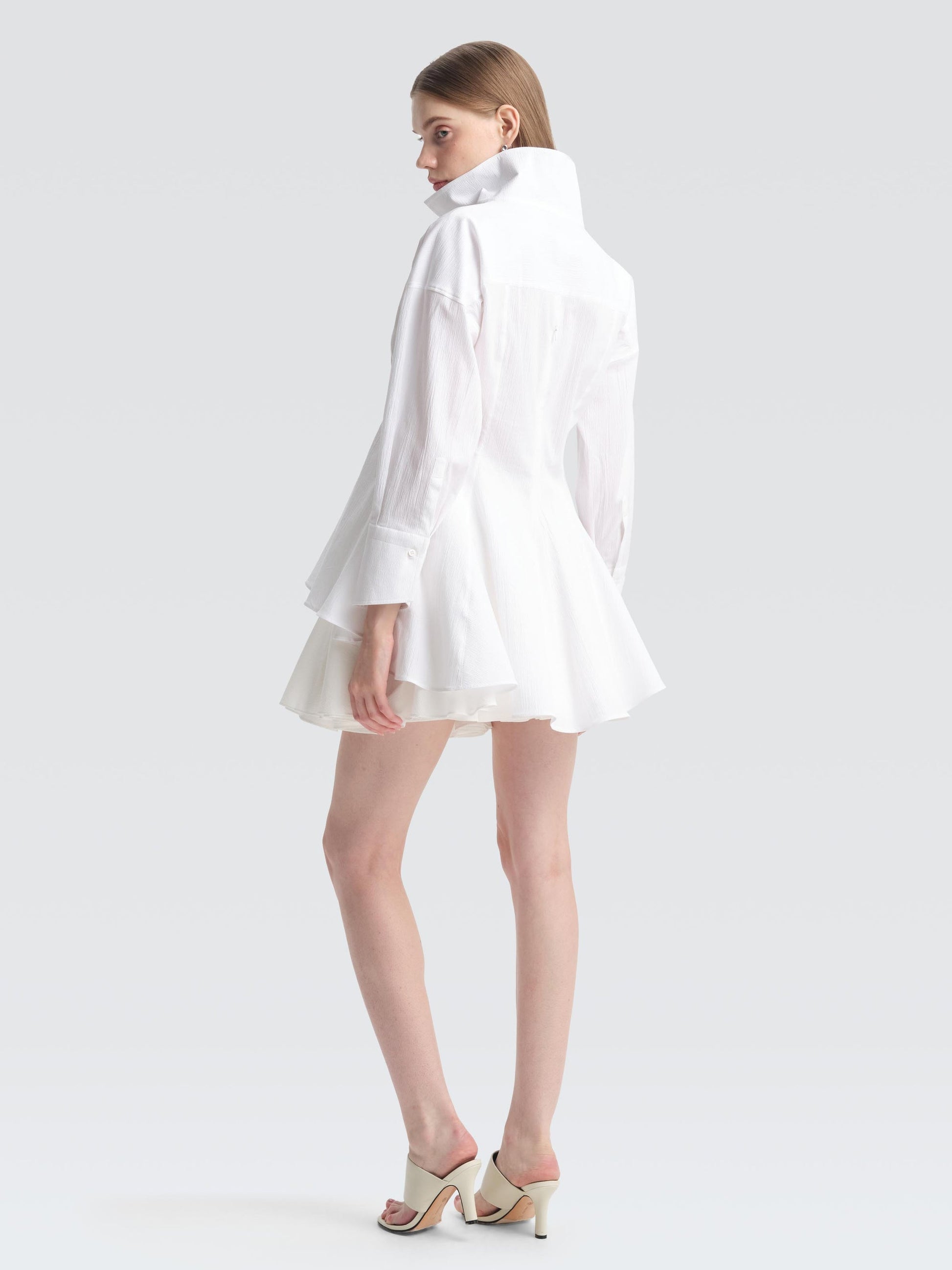 Tailored from crisp seersucker, the CONROY shirt features an open collar and body-skimming darts that flare into a graduated, fluted hem. Wear it over the STARLING skirt as styled, or pair it with sleek trousers to move effortlessly from work to dinner.