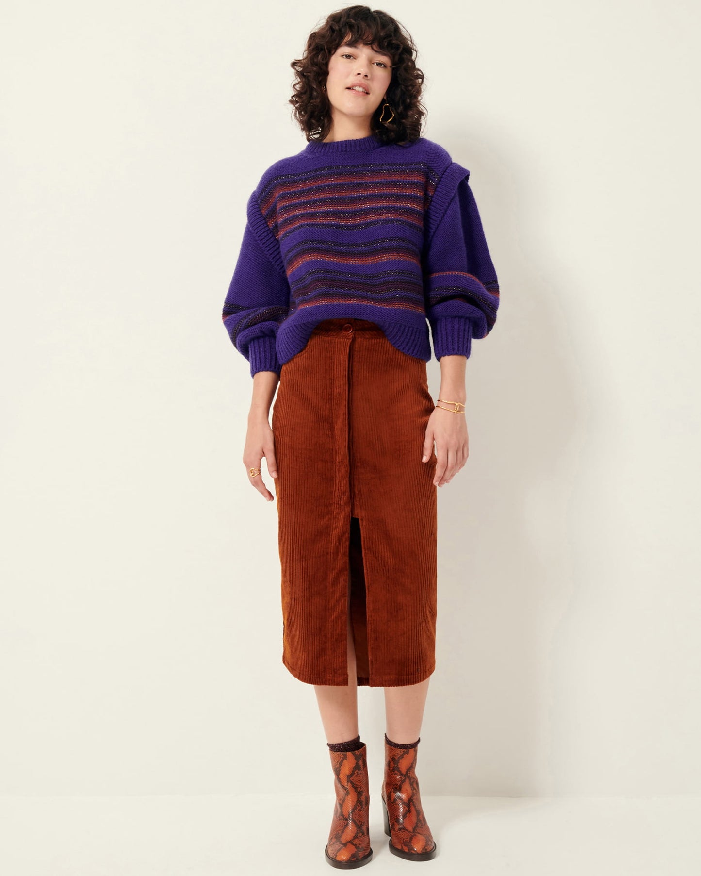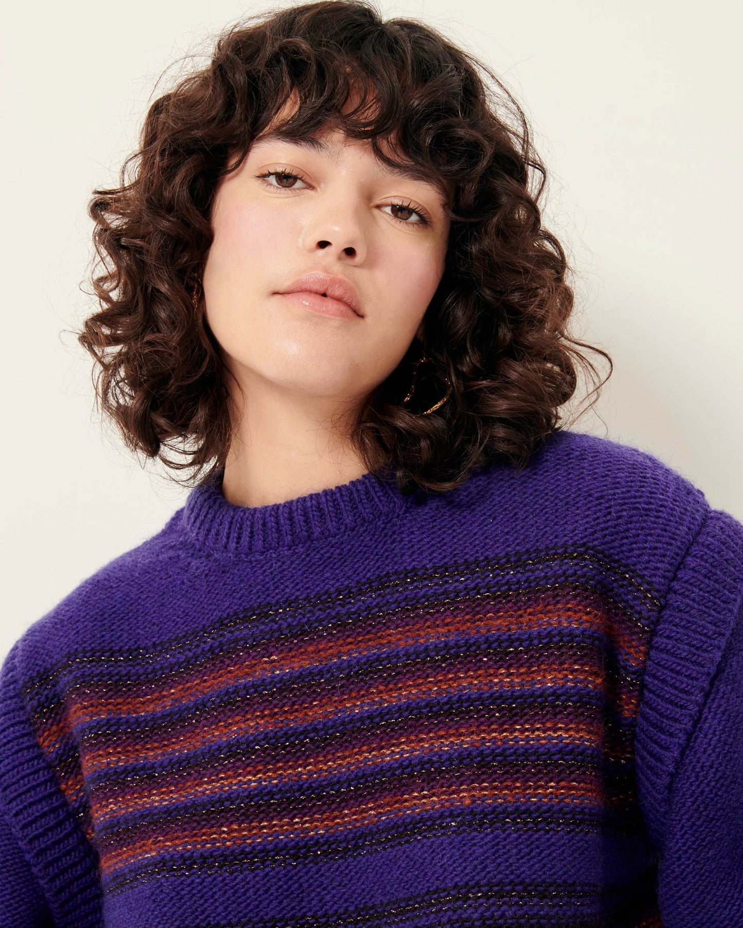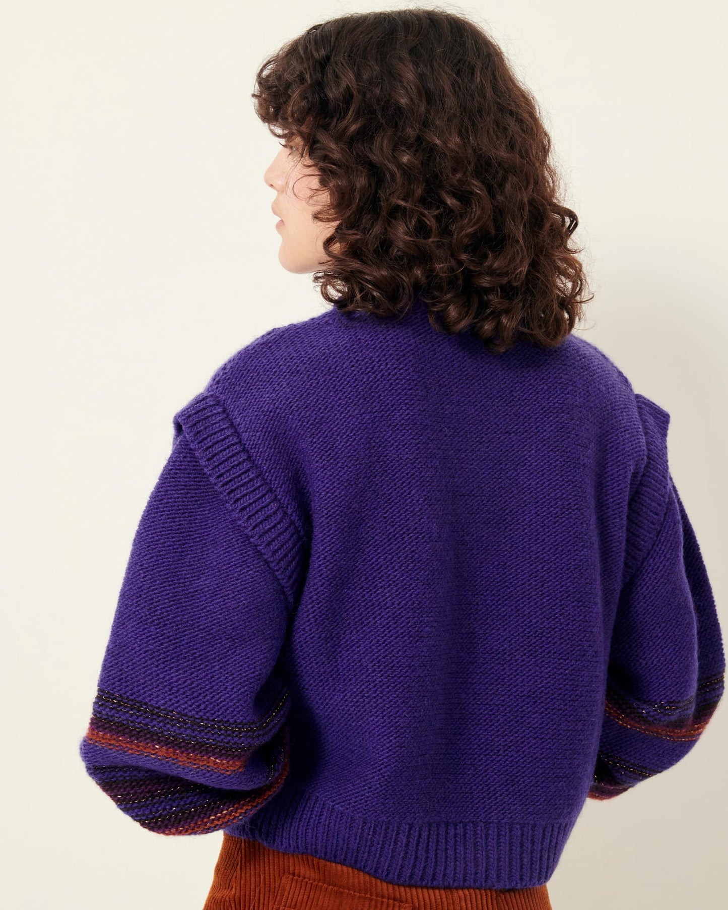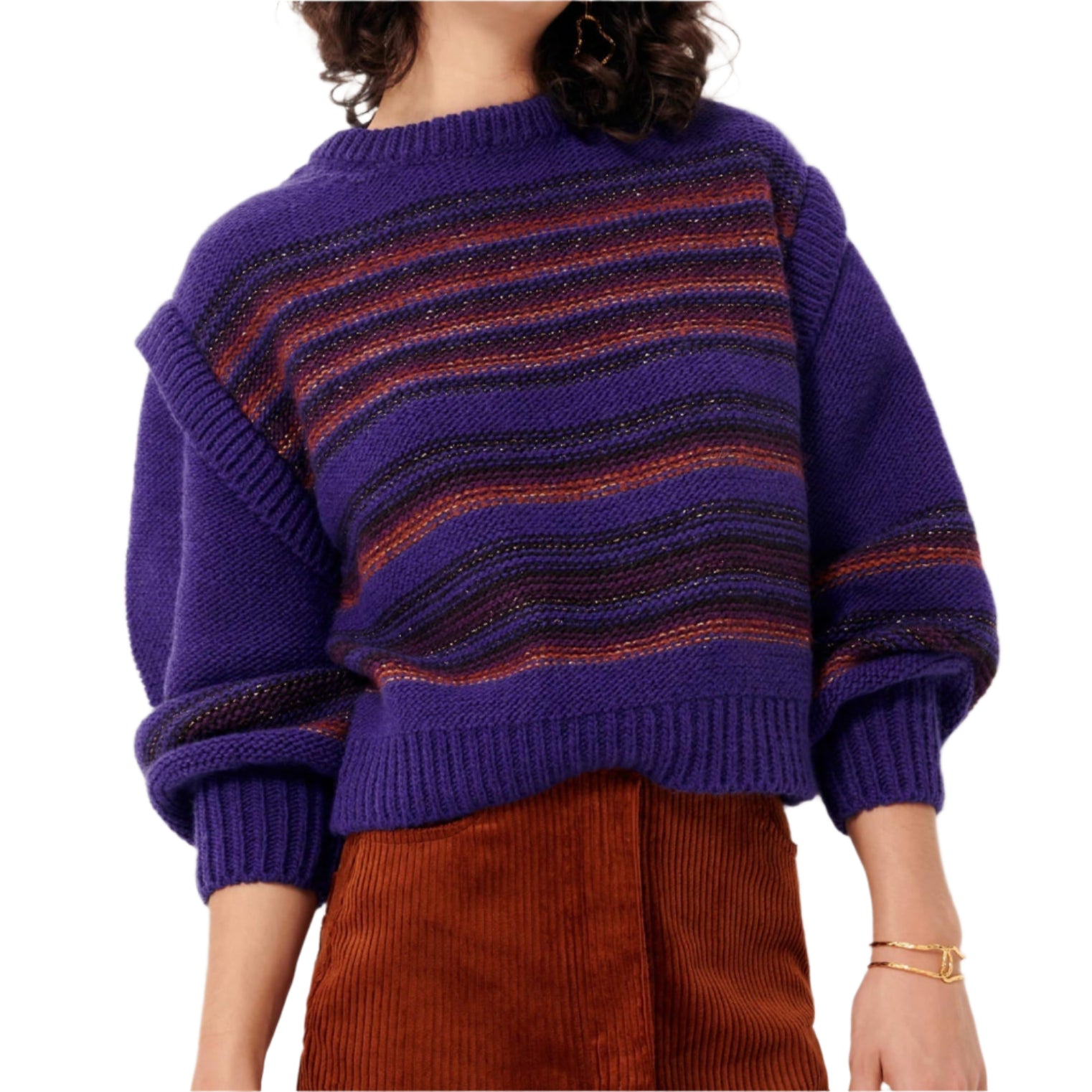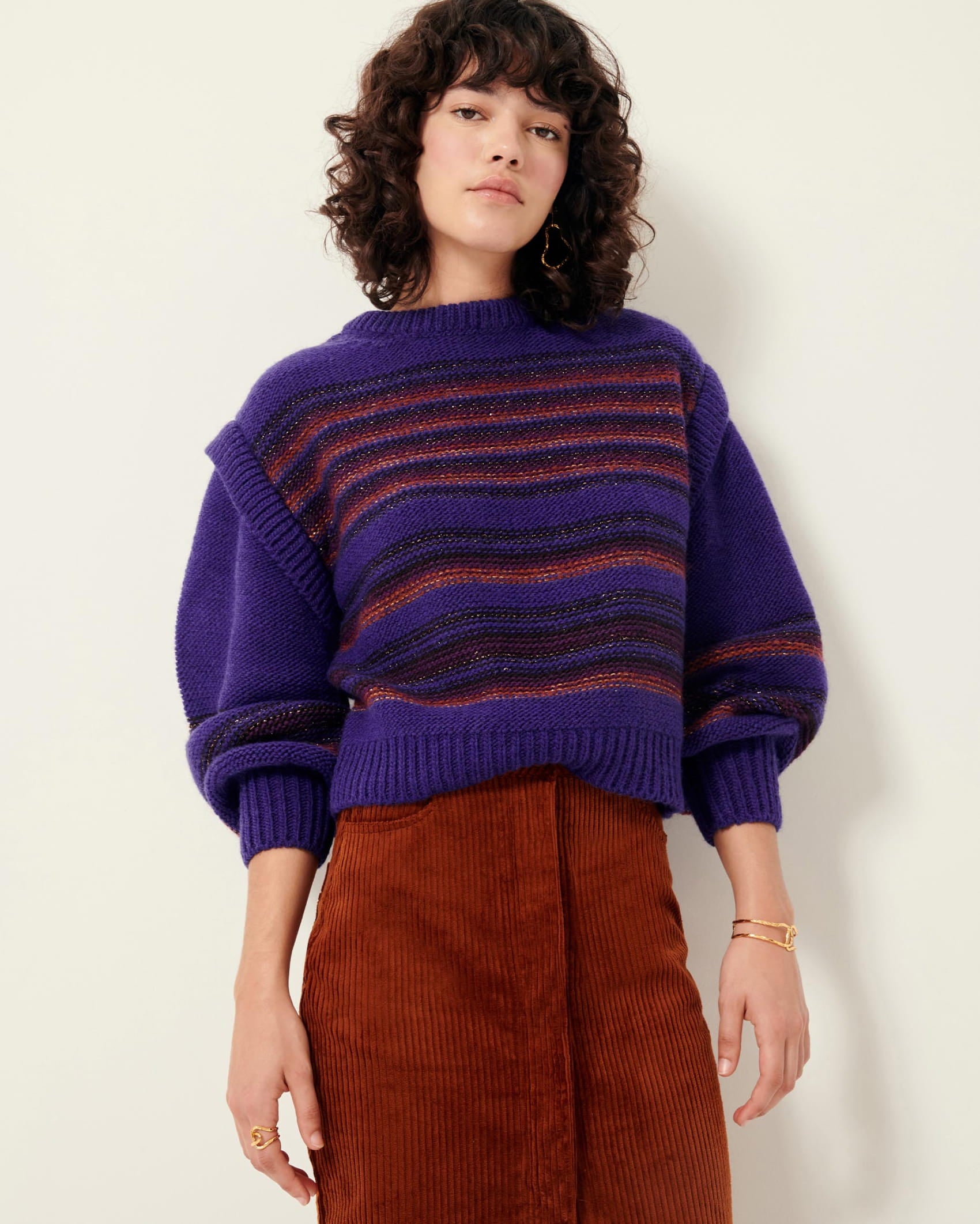 Balloon sleeve "trompe l'oeil" effect jumper in soft fancy striped knit, knitted in Italy.