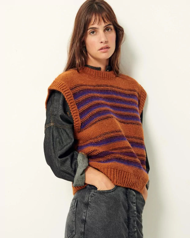 Sleeveless sweater in fluffy knit and fancy stripes knitted in Italy.