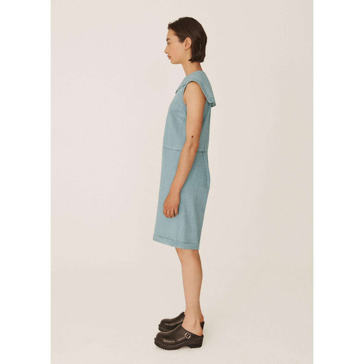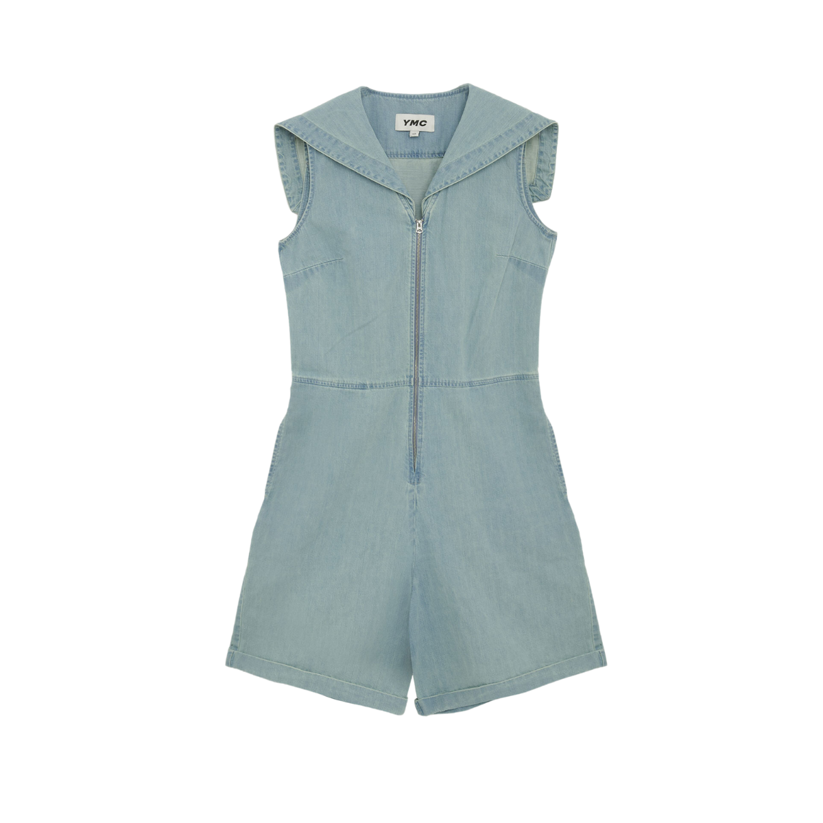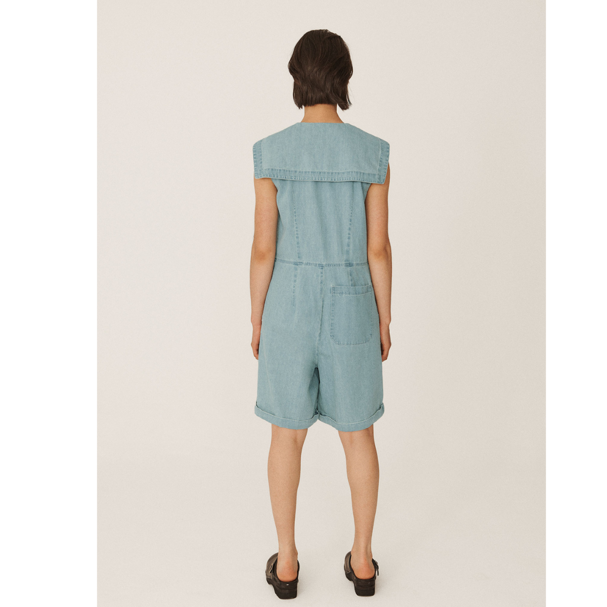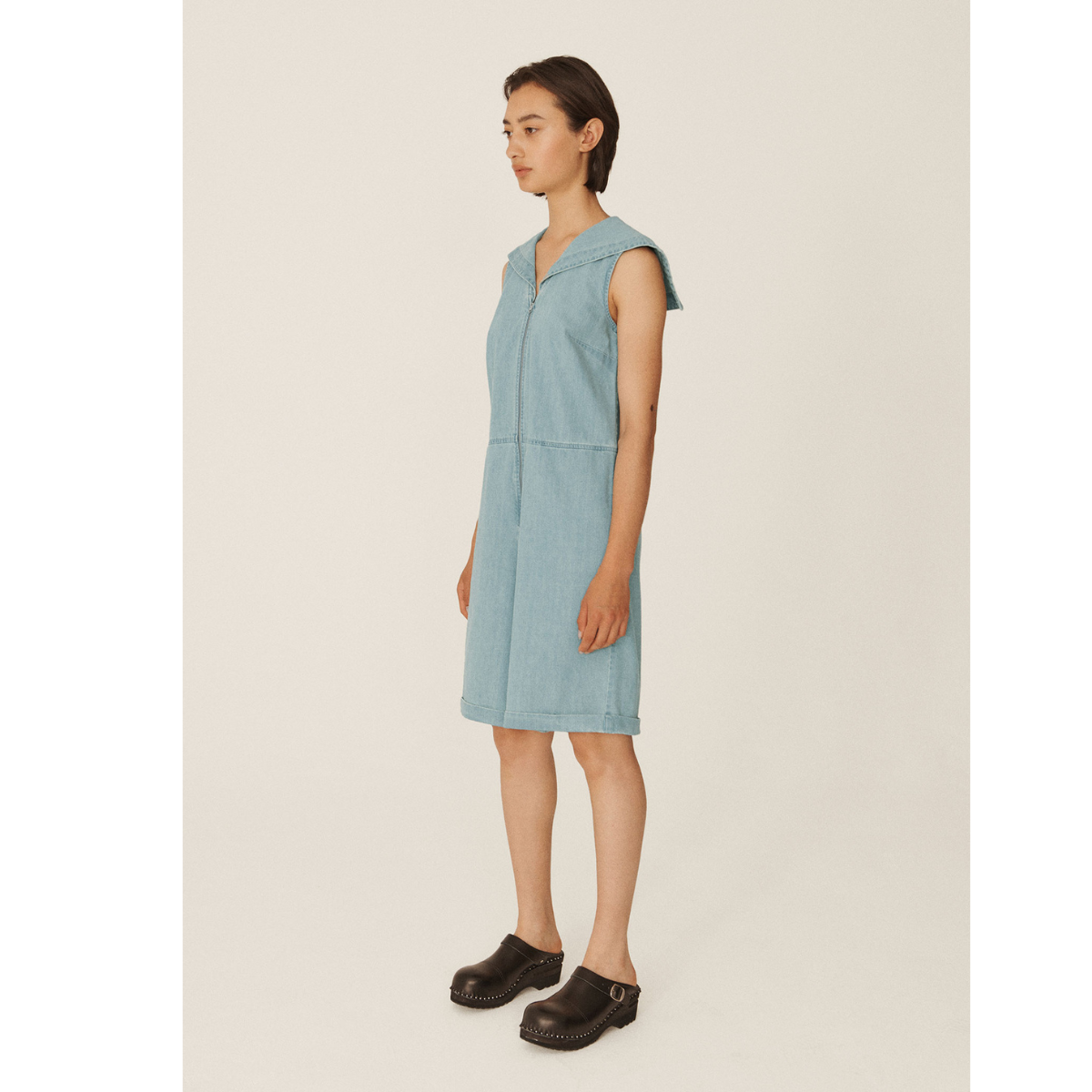 The Sindy jumpsuit is made from a lightweight organic bleached denim. Landing just below the knee.