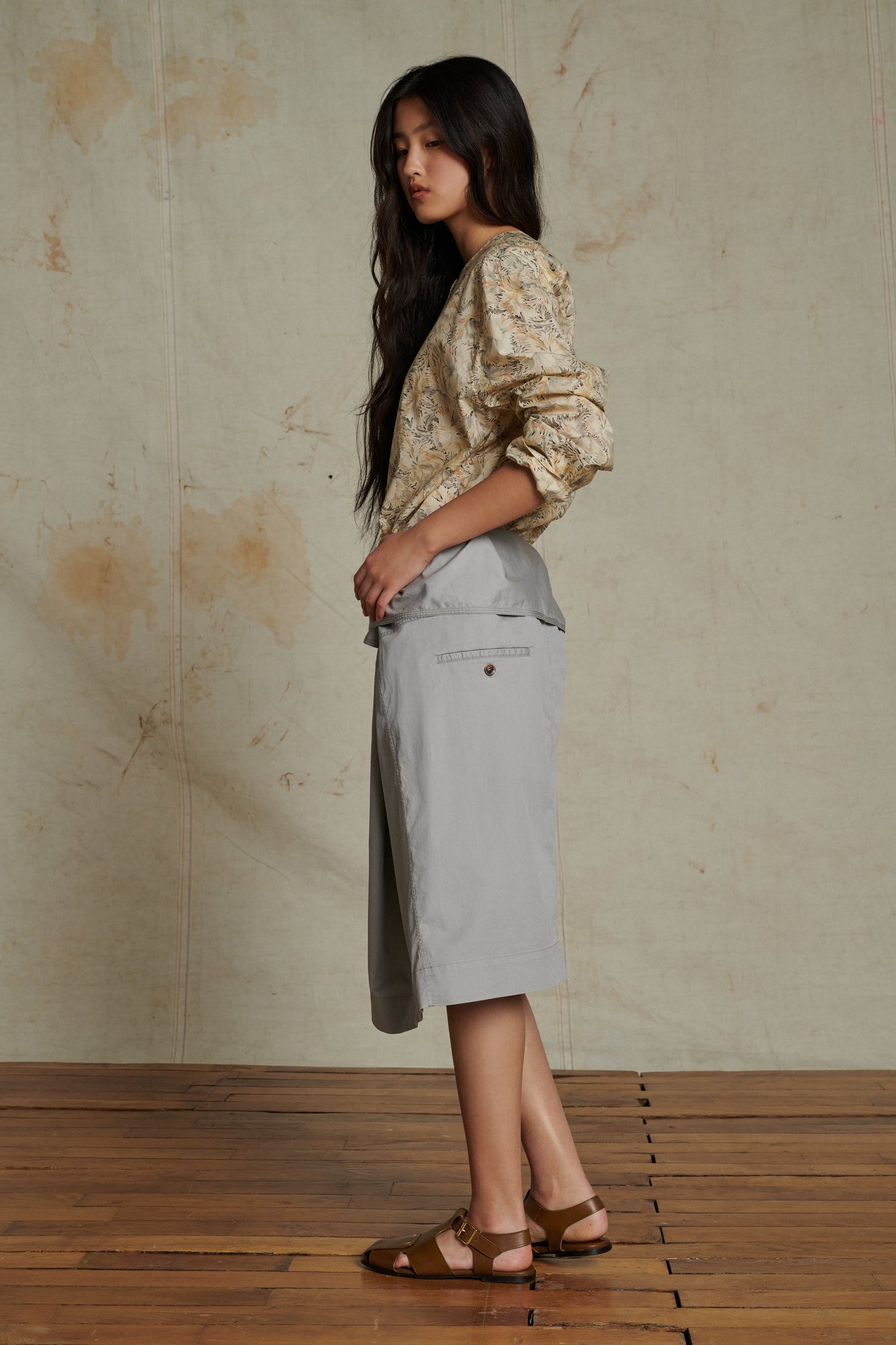 ALASKA is an oversized blouse with a round neckline. It features wide cuffs for rolling the sleeves up. The lightweight and cool cotton poplin fabric makes it an ideal choice for summer. The "Bloom" print with its pastel shades will blend beautifully with beige, gray, or white pants.