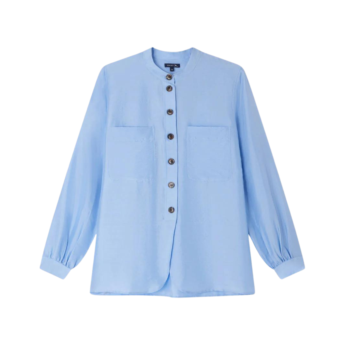 This sky blue blouse offers a light and airy style with a touch of elegance.