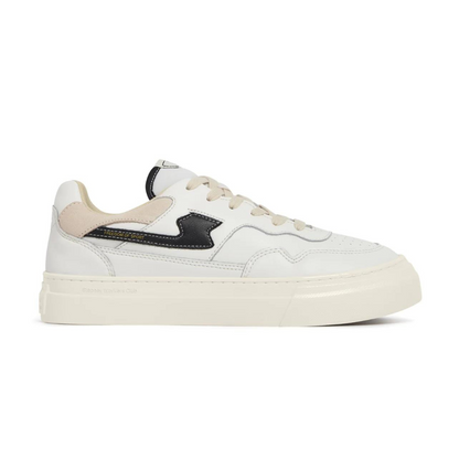 These sneakers feature white leather with black accents and the signature 'Pearl S Strike' detail.