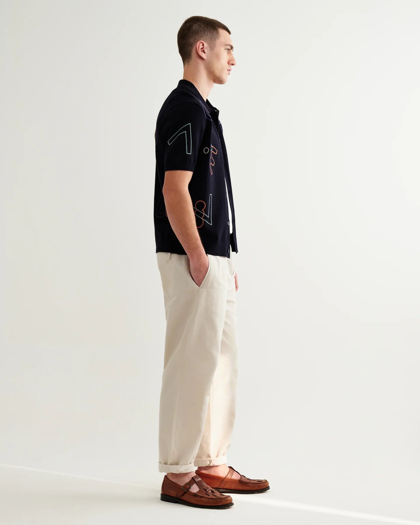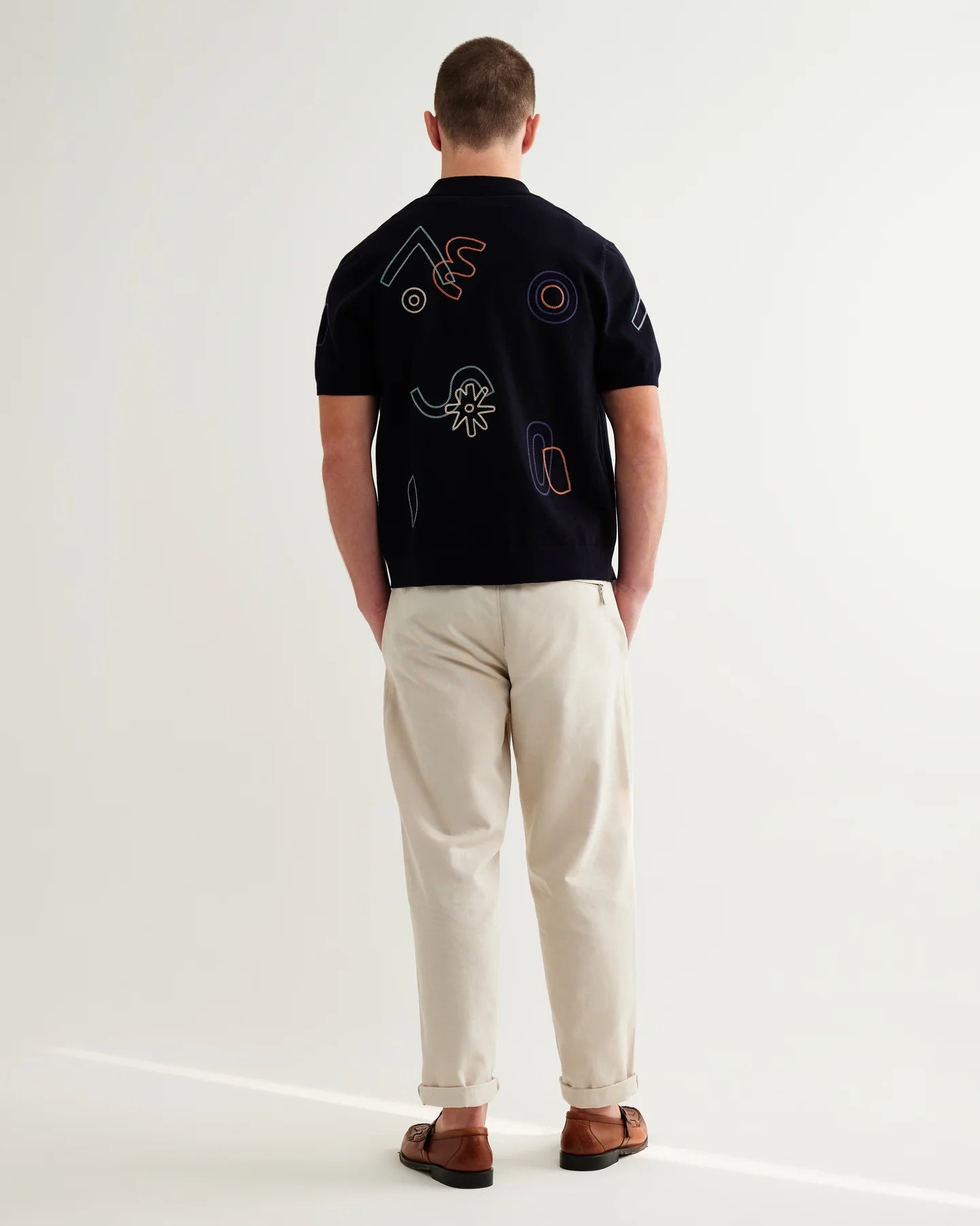 The Tellaro knitted short-sleeve shirt returns, updated with abstract artwork created through multicolour chain stitch embroidery. The design adds texture and vibrancy to the clean knit base, offering a refined yet expressive take on this seasonal staple.