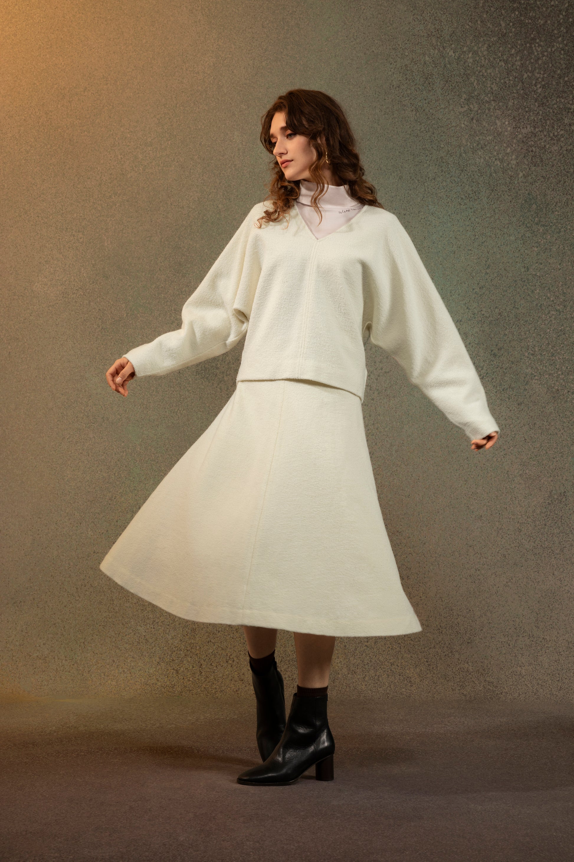 Our V-Neck Batwing Top is designed in a cocooning silhouette, with rounded sleeves and a voluminous fit. Made from a wool-blend, this top is soft to the touch and will keep you warm and chic all season long. Sophisticated and comfortable, pair it with our matching skirt for a festive ready ensemble.