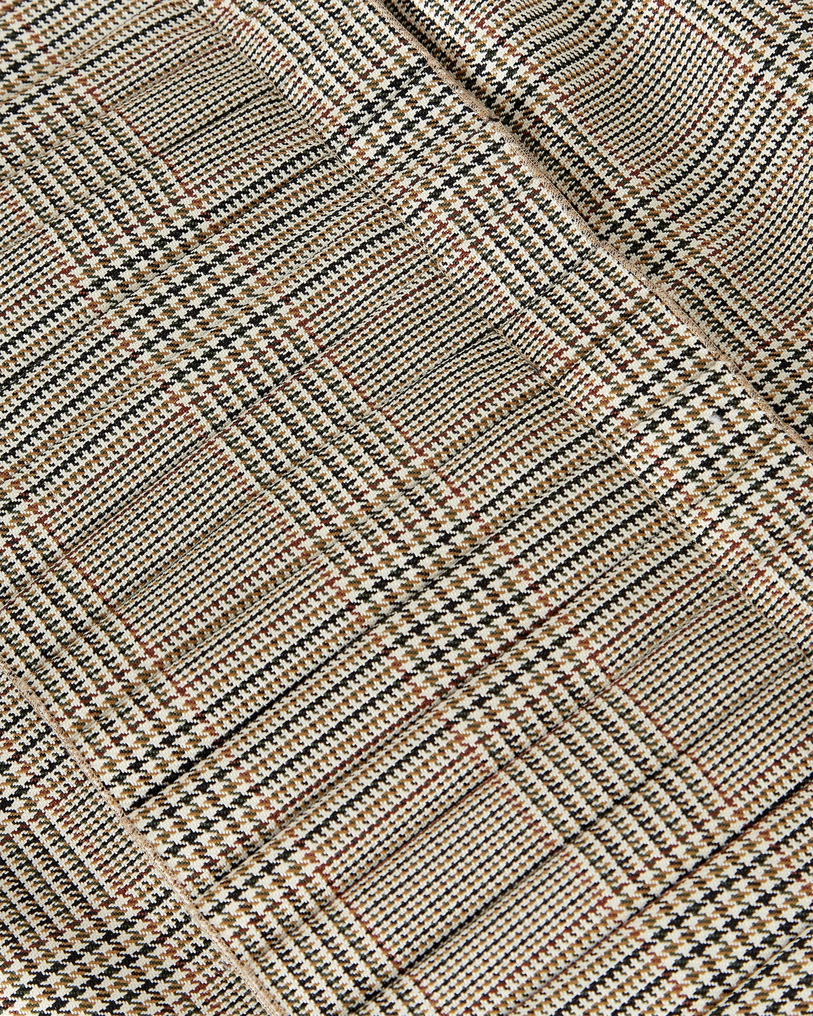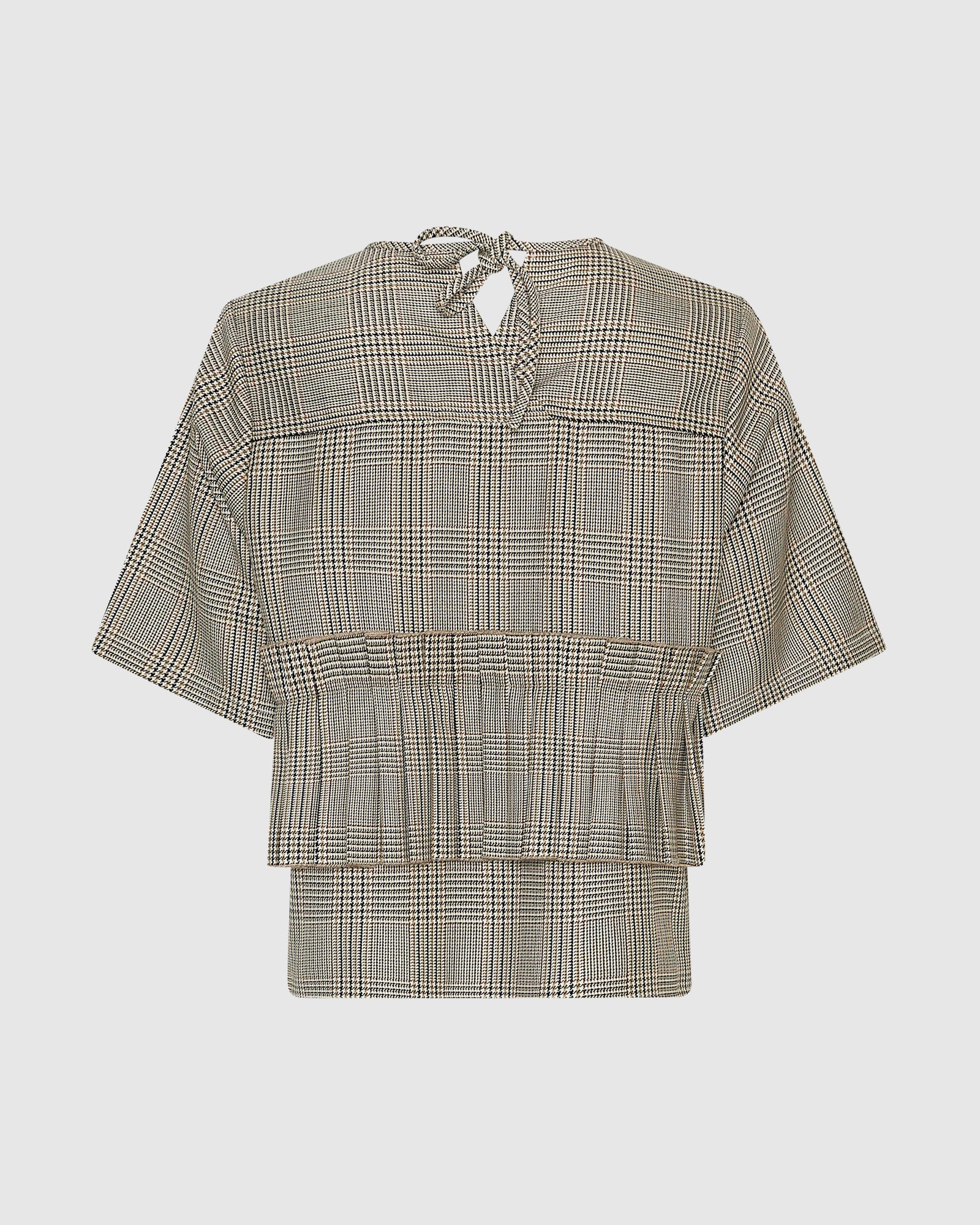 Unexpected silhouettes are a STEL signature. This new Check Top adds a modern touch to your wardrobe. Cut to a boxy fit with wide short sleeves, a tie at the back of the neck and a large pleated panel under the bust. Layer this statement piece over a crisp white shirt or honour the print with the matching Check Straight Leg Trousers