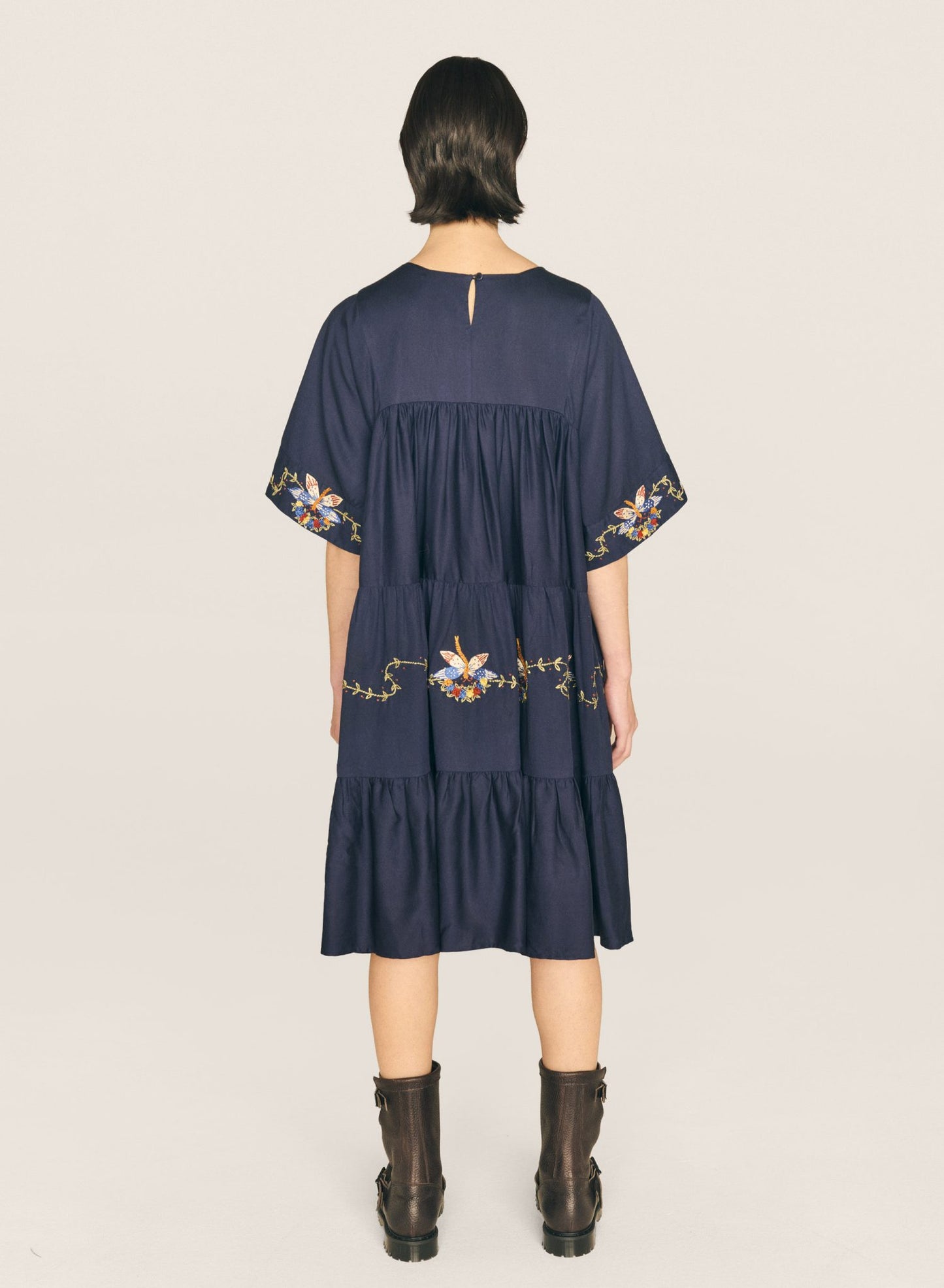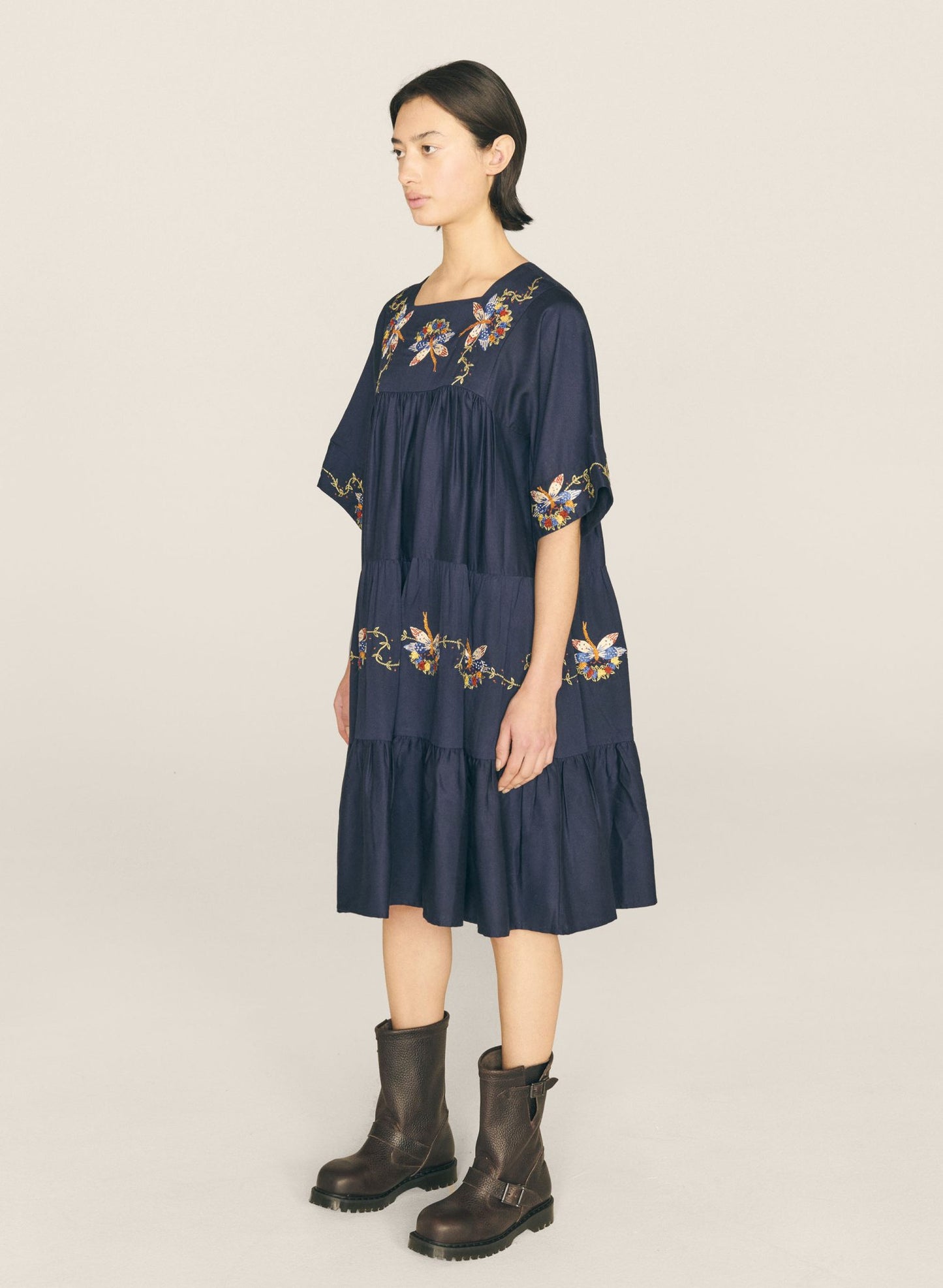 Flowy and relaxed dress. Comes in navy and finished with floral embroidery.